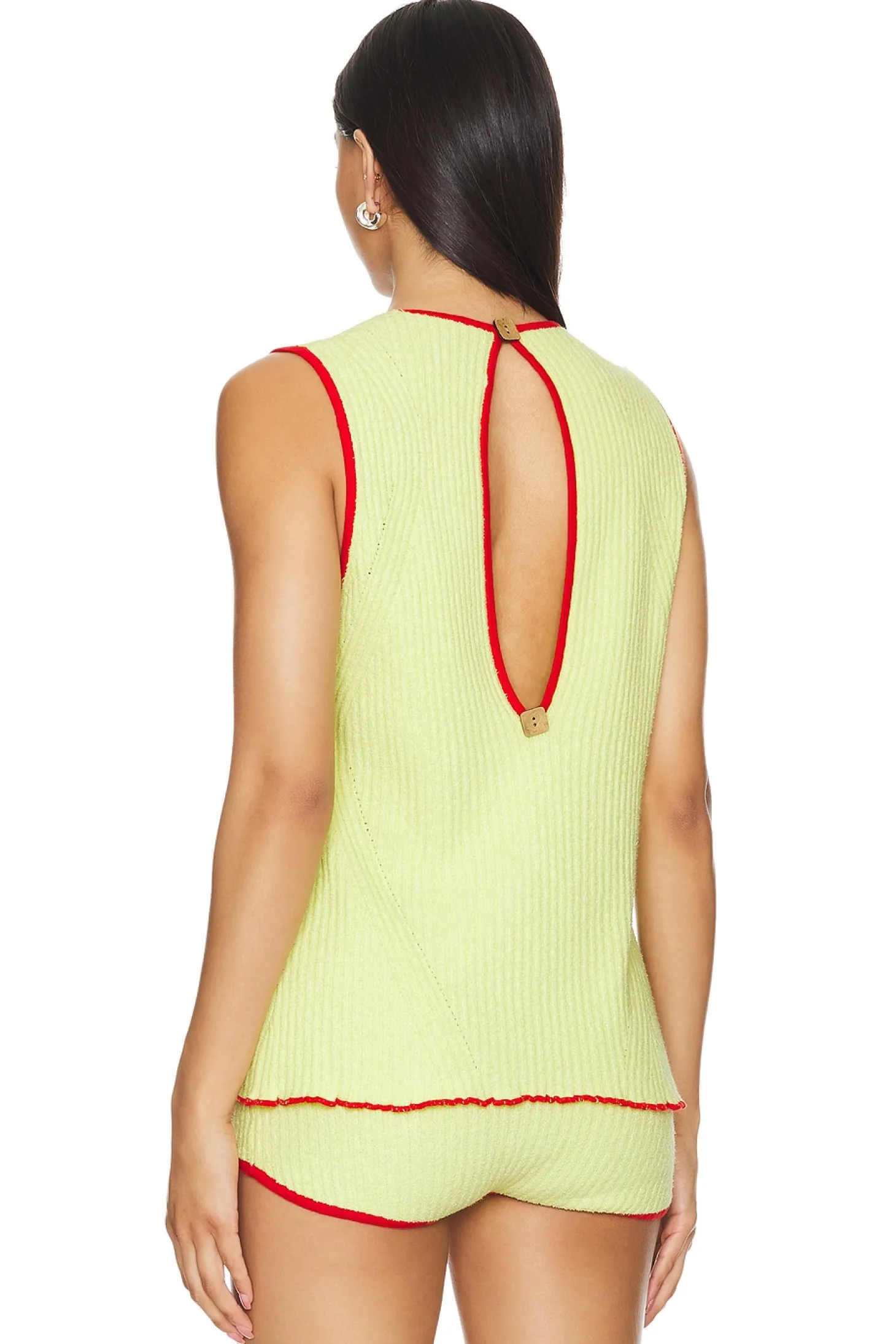 58% recycled nylon 42% cotton.Made in China.Machine wash.Front loop button closure.Lightweight ribbed French Terry fabric.Item not sold as a set