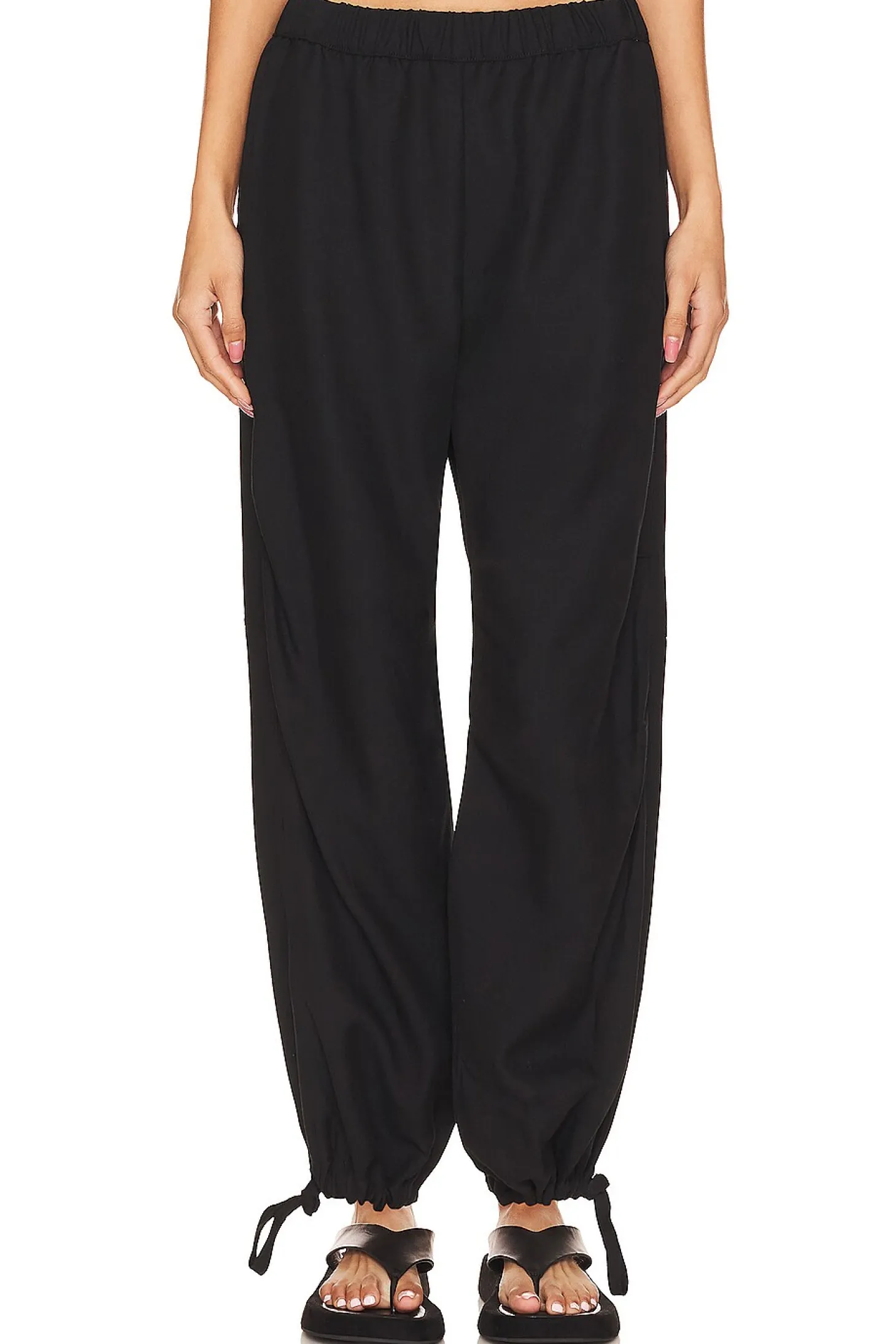 81% viscose 16% polyester 3% spandex.Made in USA.Machine wash.Pull-on styling with elastic waistband.Drawcord jogger hem.Twill fabric.22" at the knee narrows to 10" at the leg opening Size 1/S waist circumference measures approx 28"