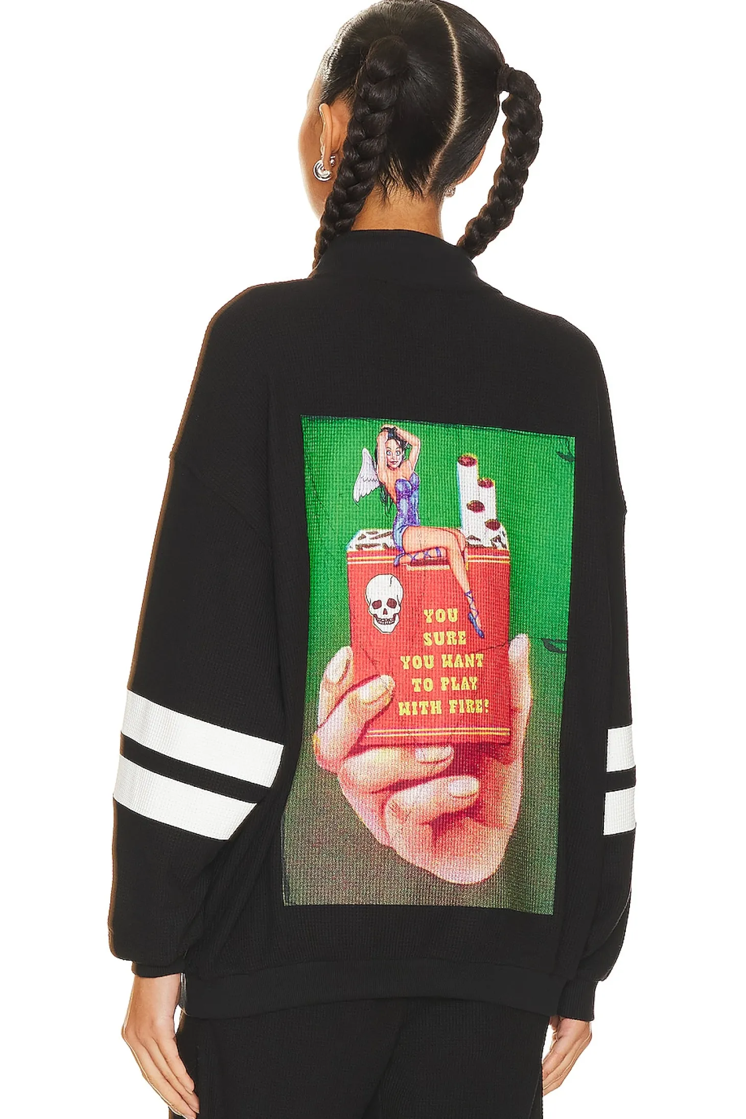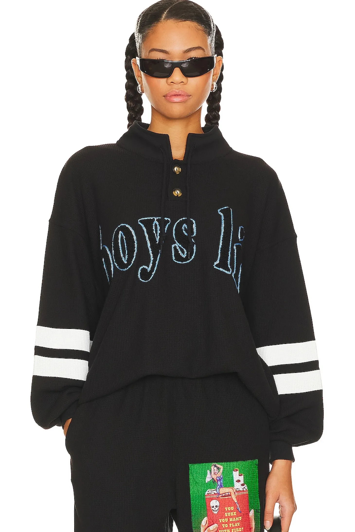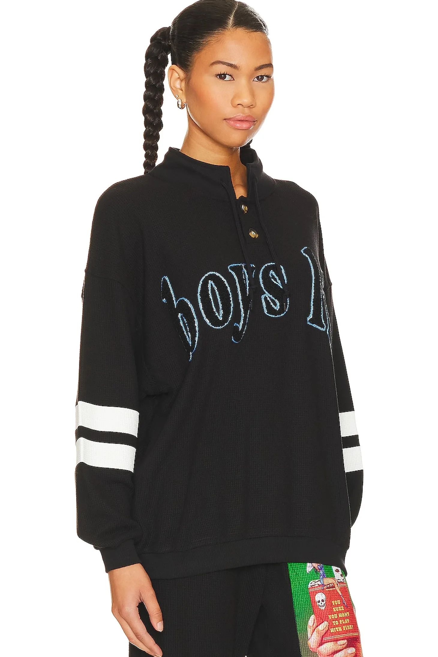 68% polyester 29% rayon 3% spandex.Made in China.Machine wash.Partial front button closure.Drawstring collar.Front embroidered logo detail.Back screenprint graphic Thermal waffle knit fabric.Item not sold as a set
