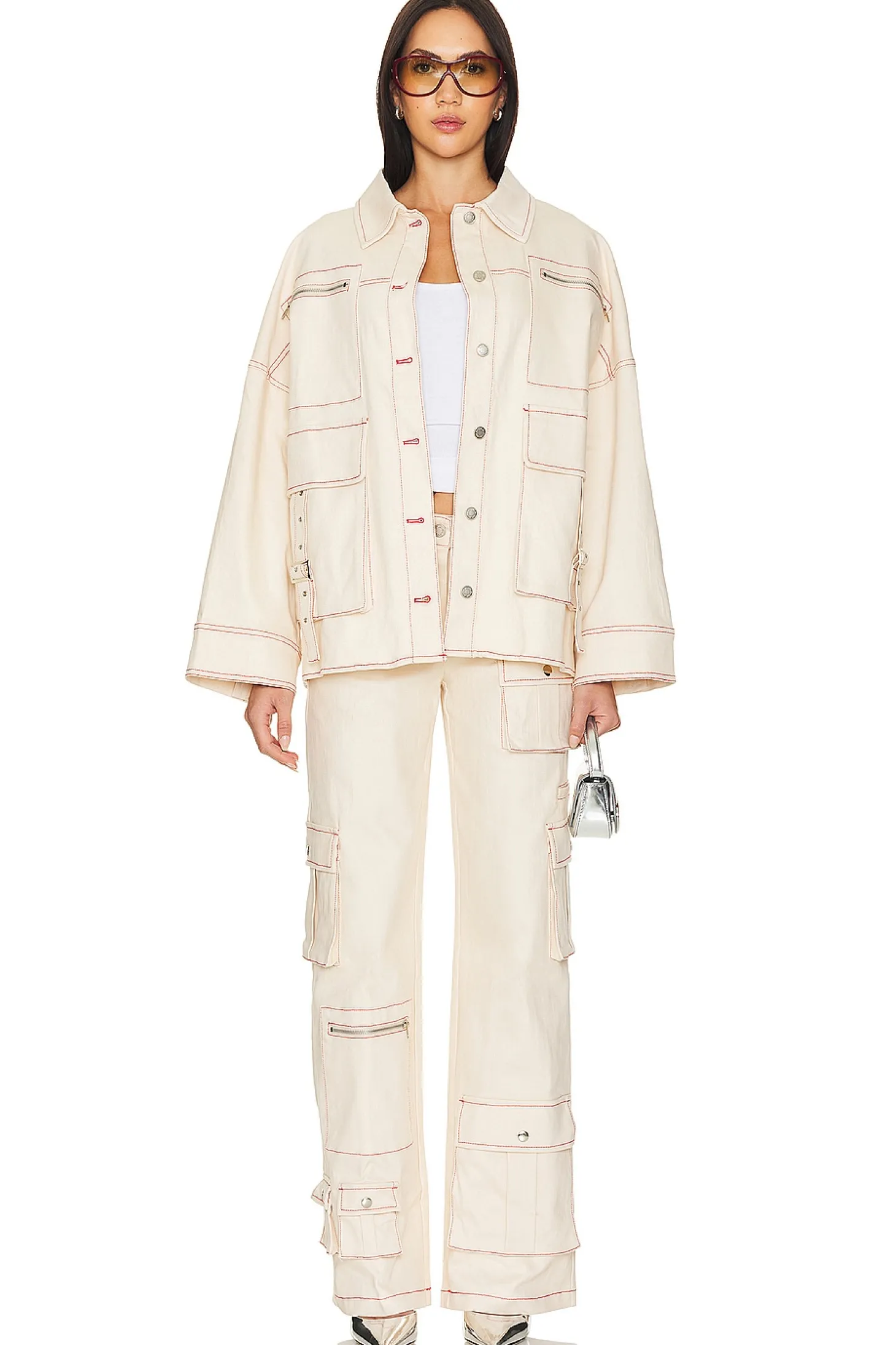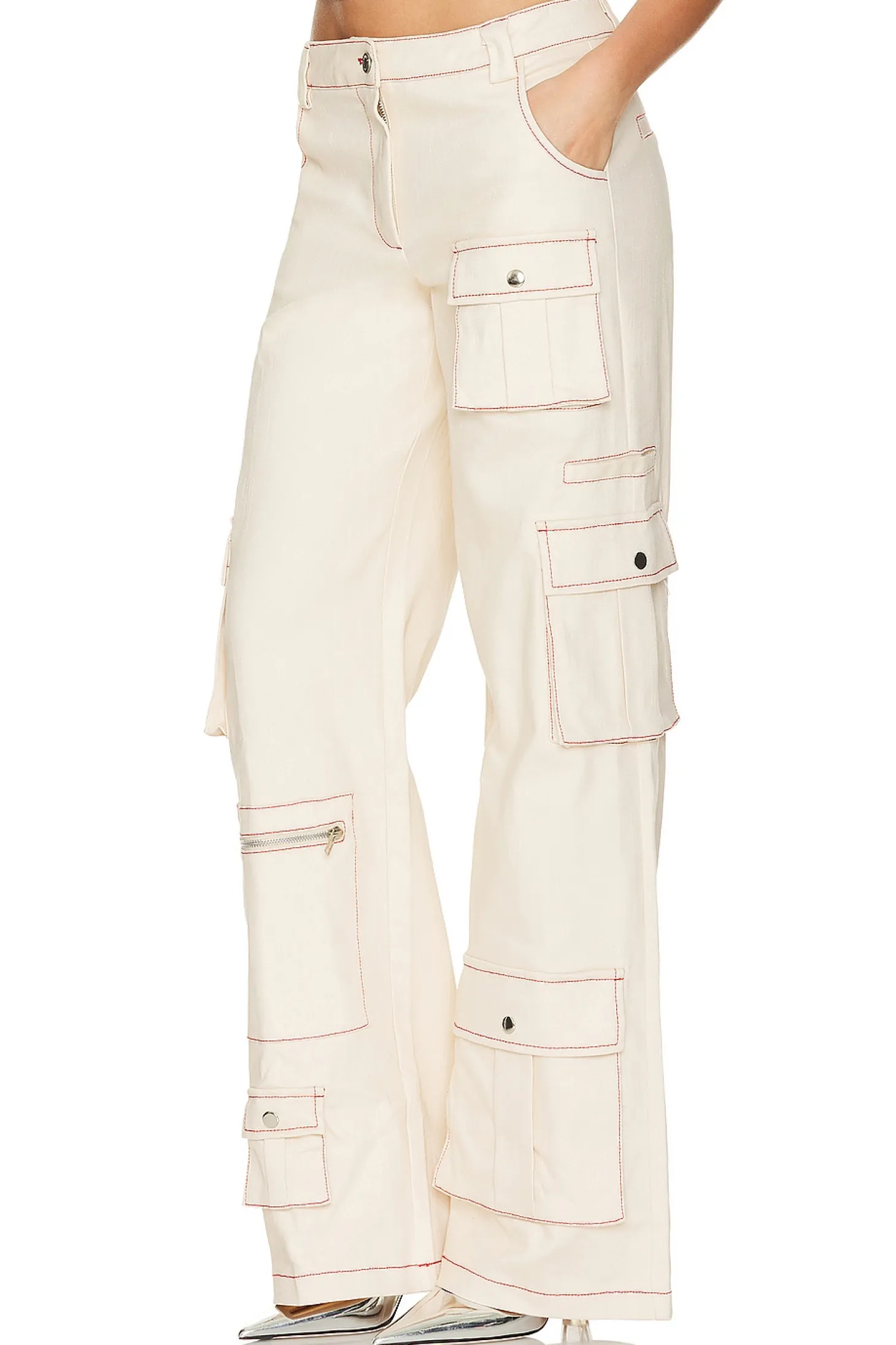 97% cotton 3% elastane.Made in China.Machine wash.Zip fly with button closure.11-pocket styling includes 6 cargo button pockets and 1 cargo zipper pocket.Rigid denim.Item not sold as set.22" at the knee and 22" at the leg opening Waist circumference measures approx 31"