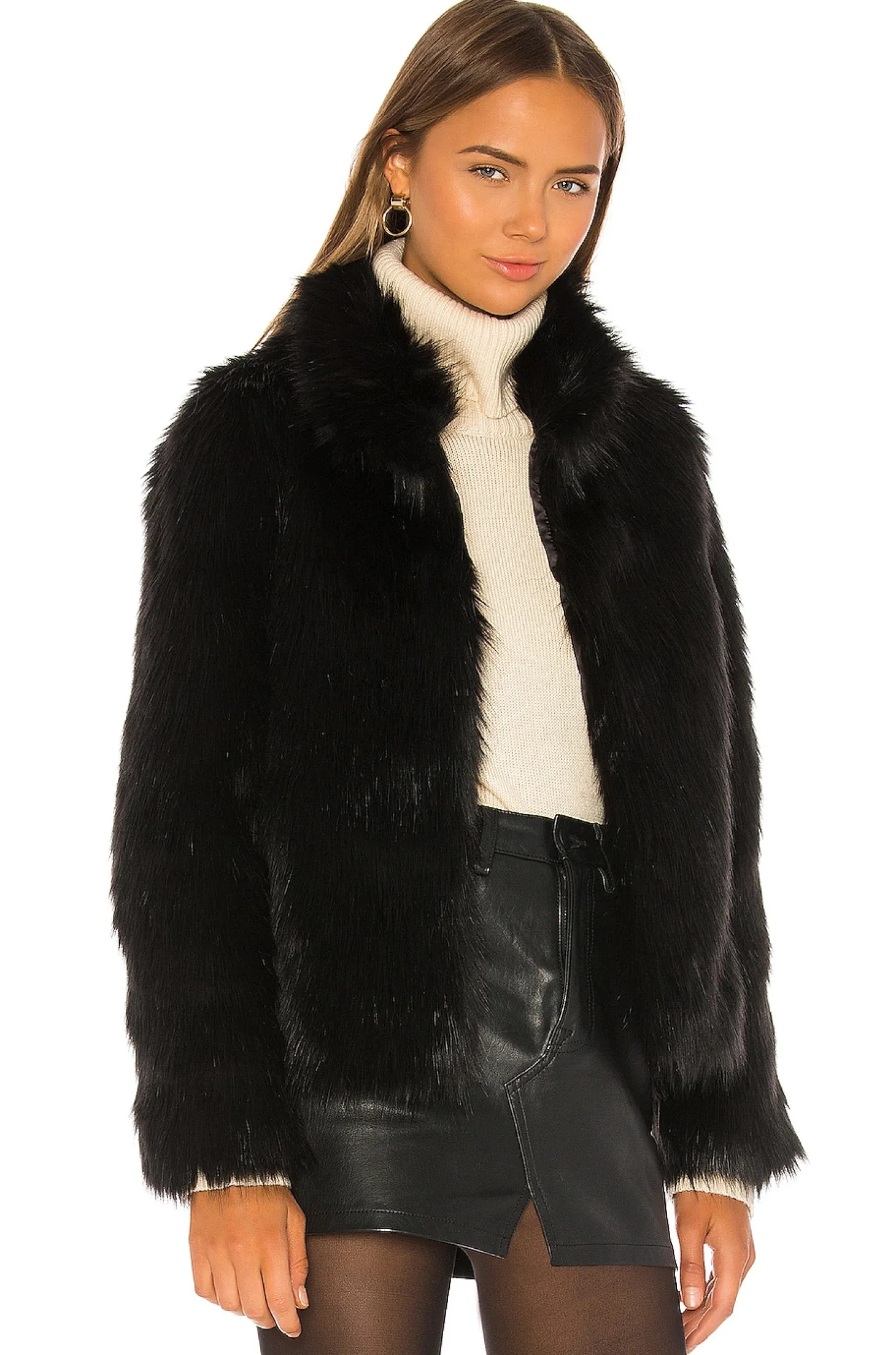 Self: 100% modacrylic Lining: 95% poly 5% elastane.Dry clean only.Hidden front latch closure.Side seam pockets.Interior front slit pocket.Faux fur.Imported
