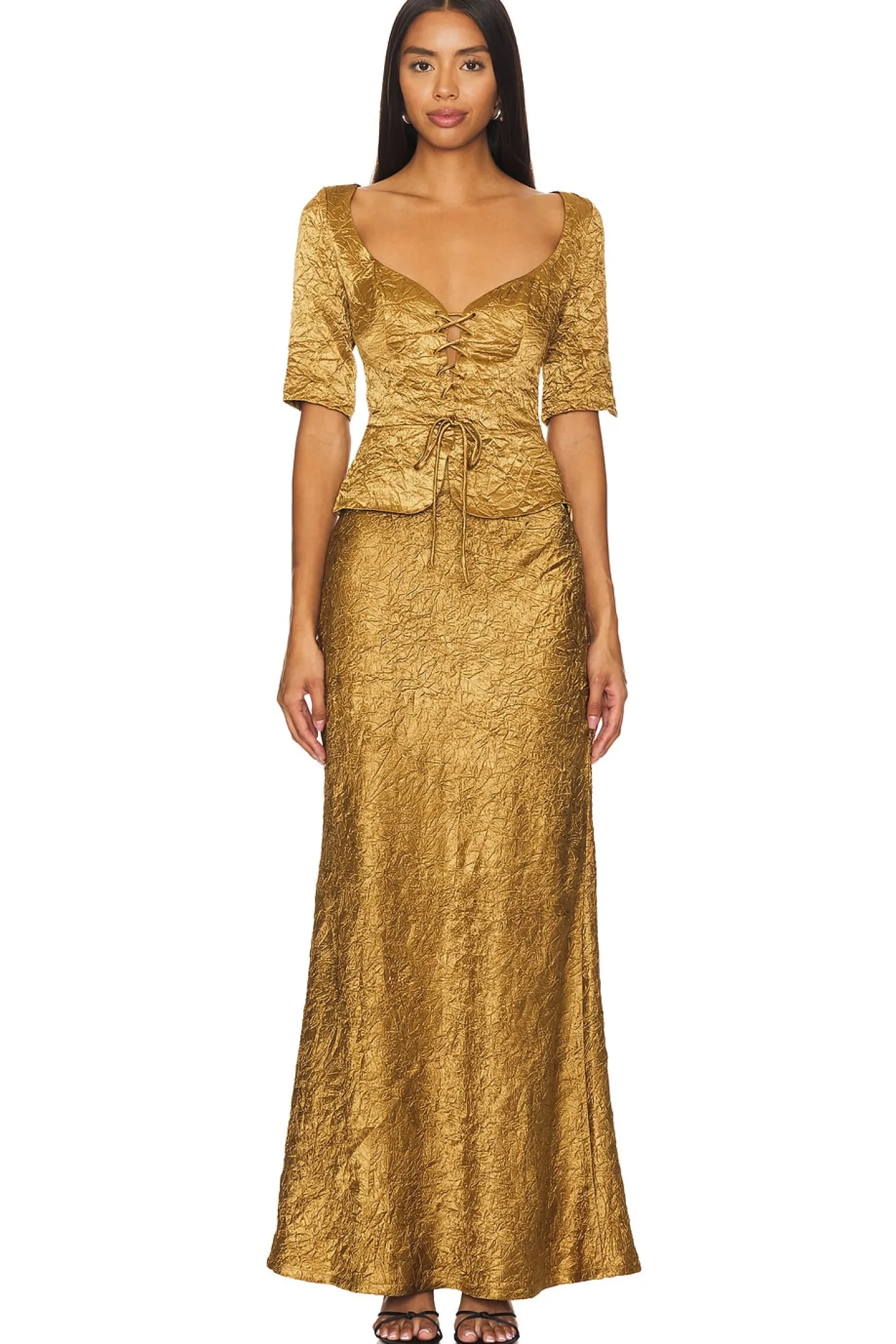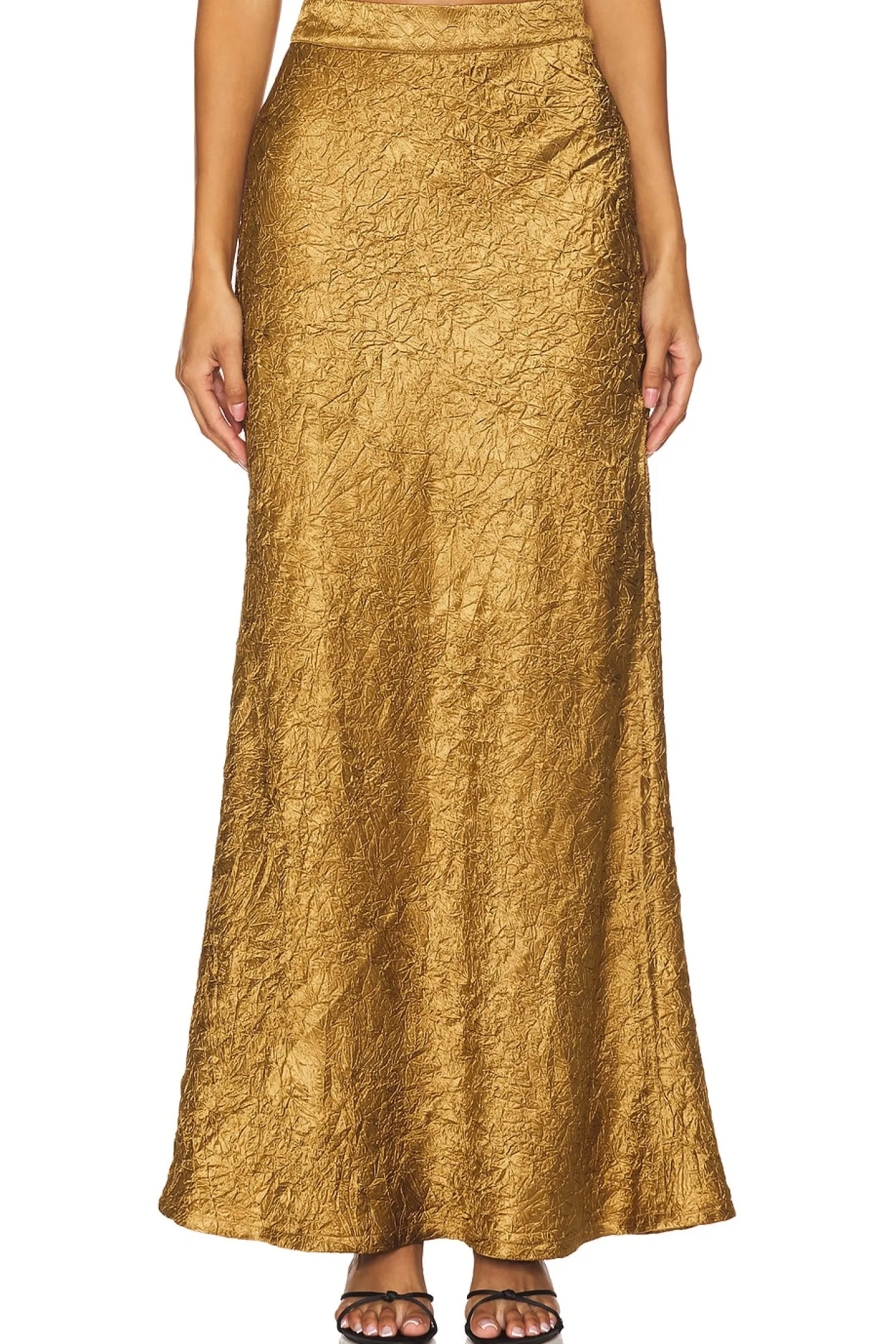 Sateen textile.Imported.Dry clean recommended.Unlined.Hidden side zip closure.Textured sateen fabric.Item not sold as set.Skirt measures approx 46" in length