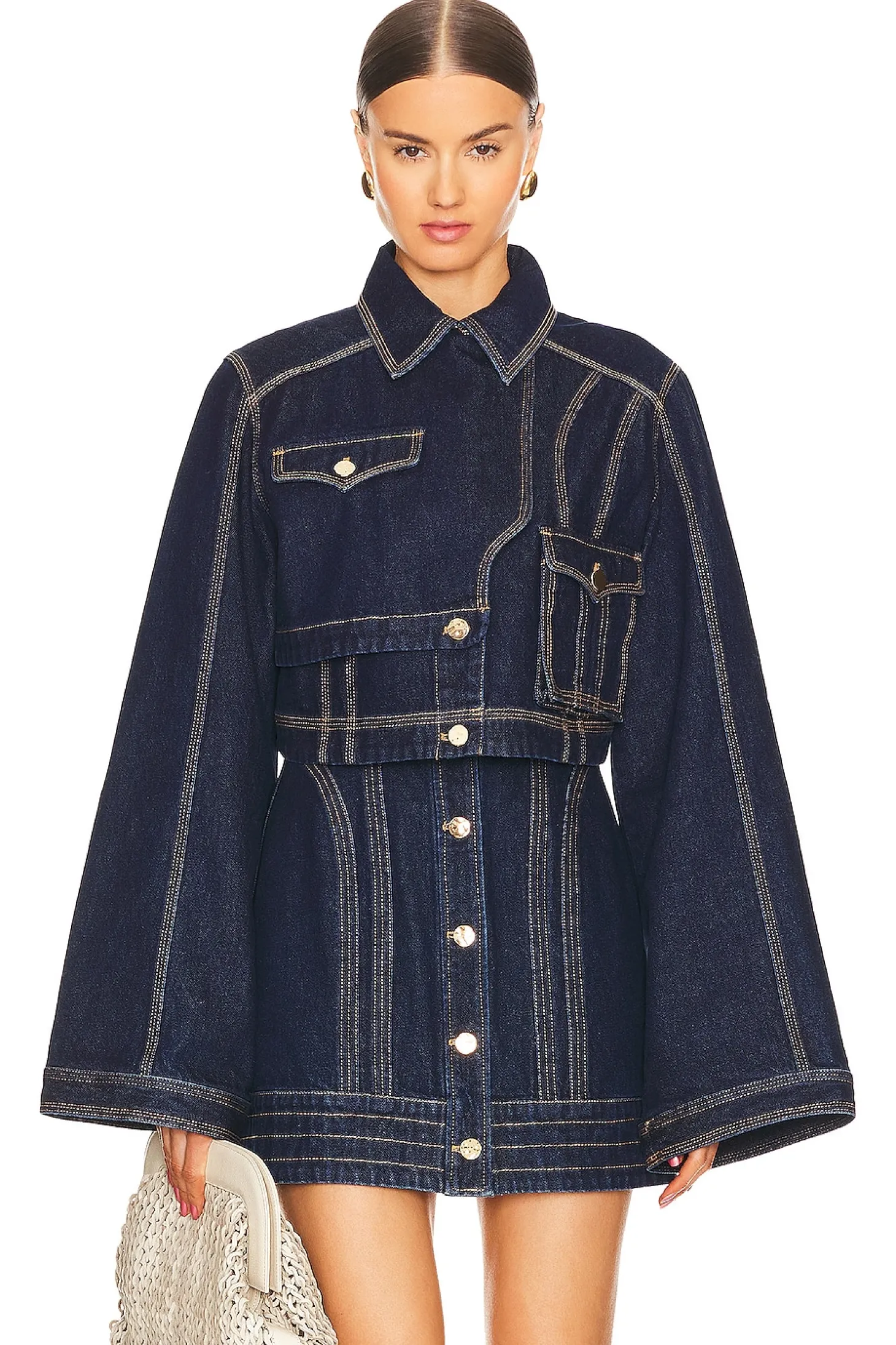 Cotton blend.Made in China.Machine wash cold.Front gold-tone button closure.Single breast flap pocket with button closure.Midweight denim fabric.Item not sold as a set