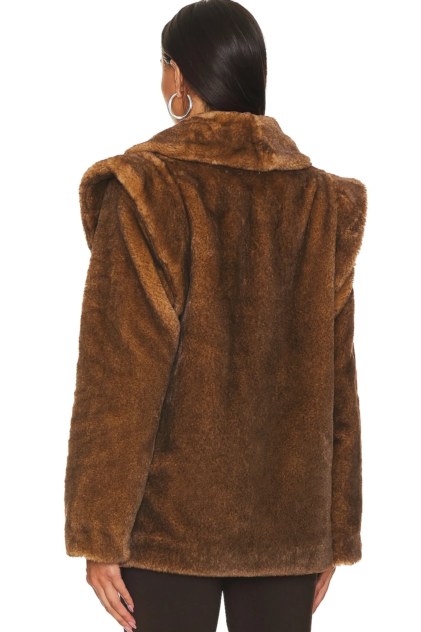 Self: 100% polyester Lining: 55% polyester 45% viscose.Made in China.Dry clean only.Front hook and bar closure.Front slip pockets.Detachable sleeves.Side slip pockets.Faux fur fabric