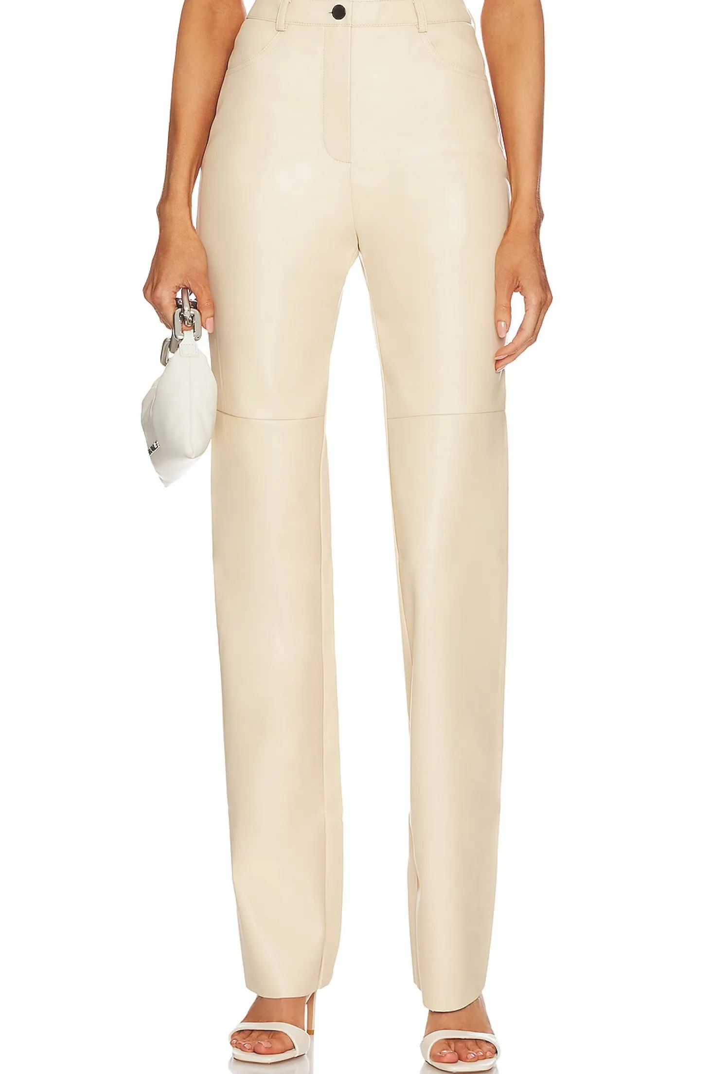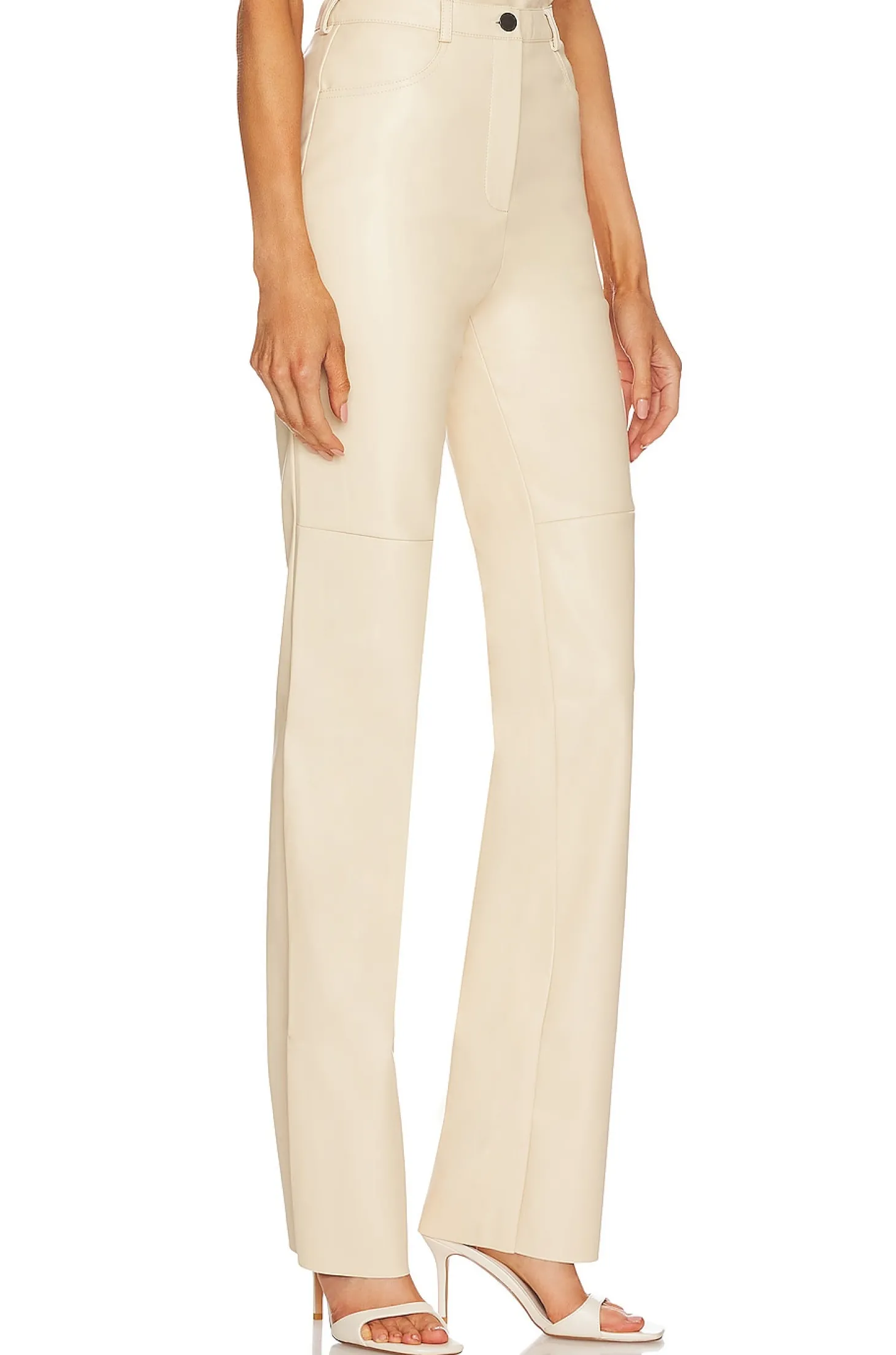56% recycled polyester 44% polyurethane.Made in Ukraine.Dry clean only.Zip fly with button closure.4-pocket styling.Faux leather fabric.Item not sold as a set.16" at the knee and 16" at the leg opening