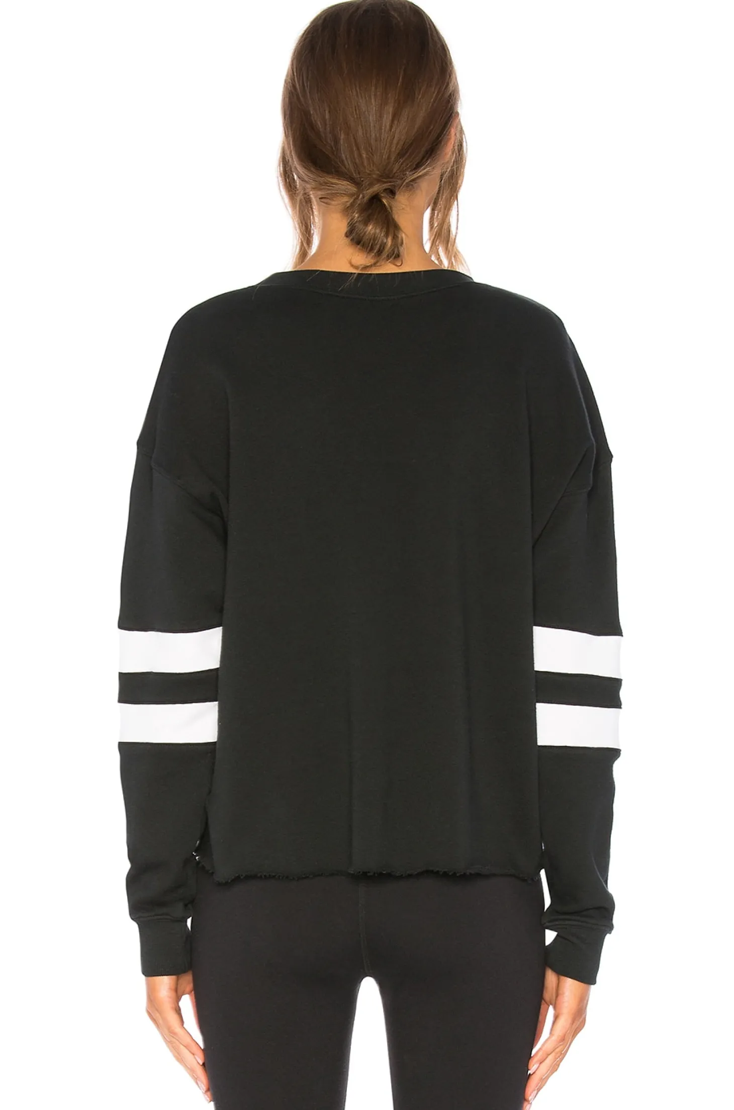 100% cotton.Sleeve striping detail.Ribbed trim.Raw cut bottom hem.Made in USA