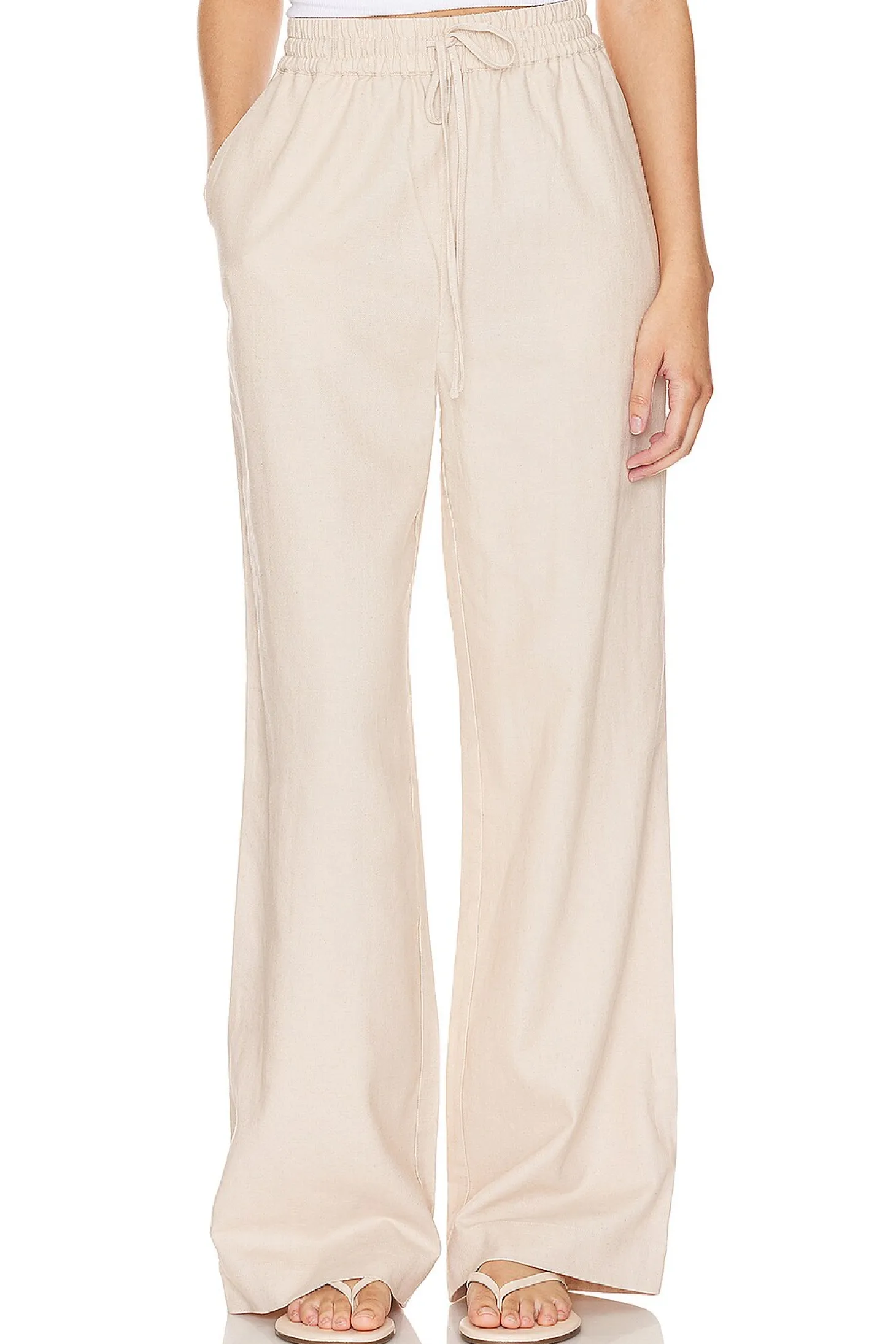 Self: 75% cotton 25% linen Lining: 100% polyester.Made in China.Hand wash.Elastic drawstring waist tie.Side seam pockets.Linen fabric.22" at the knee and 22" at the leg opening Size S waist circumference measures approx 29"