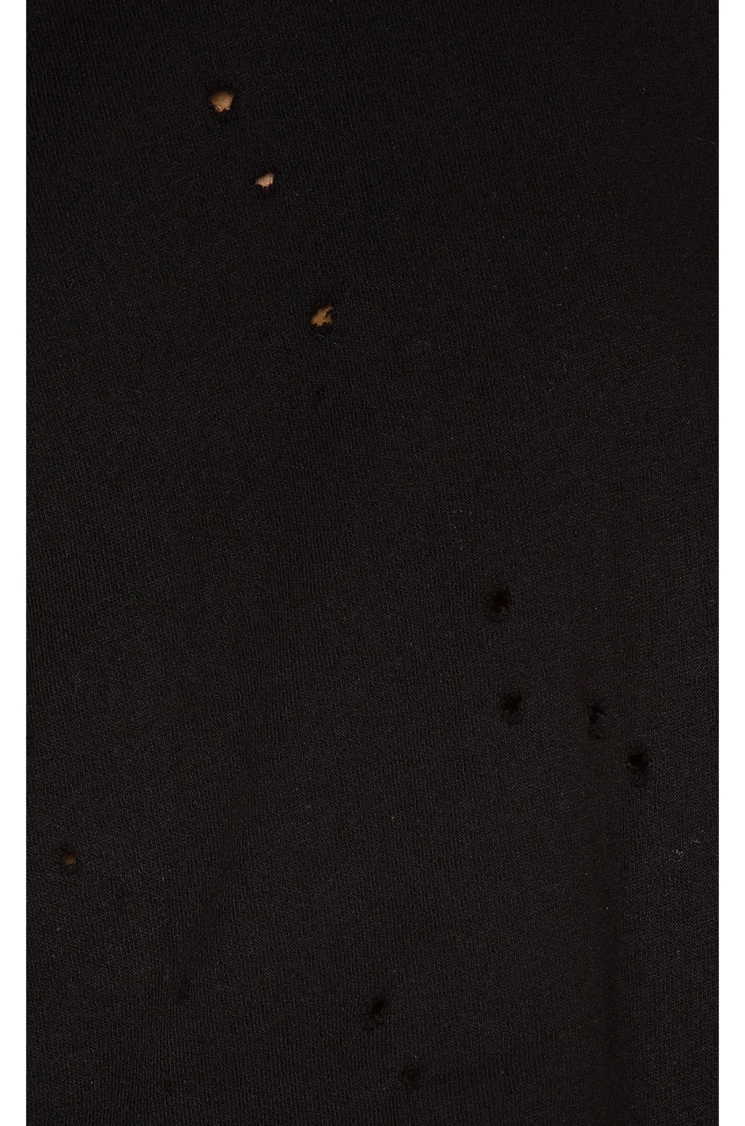 100% cotton.Intentionally destroyed detail.Shoulder cut-out.Ribbed edges.Fleece fabric.Made in USA