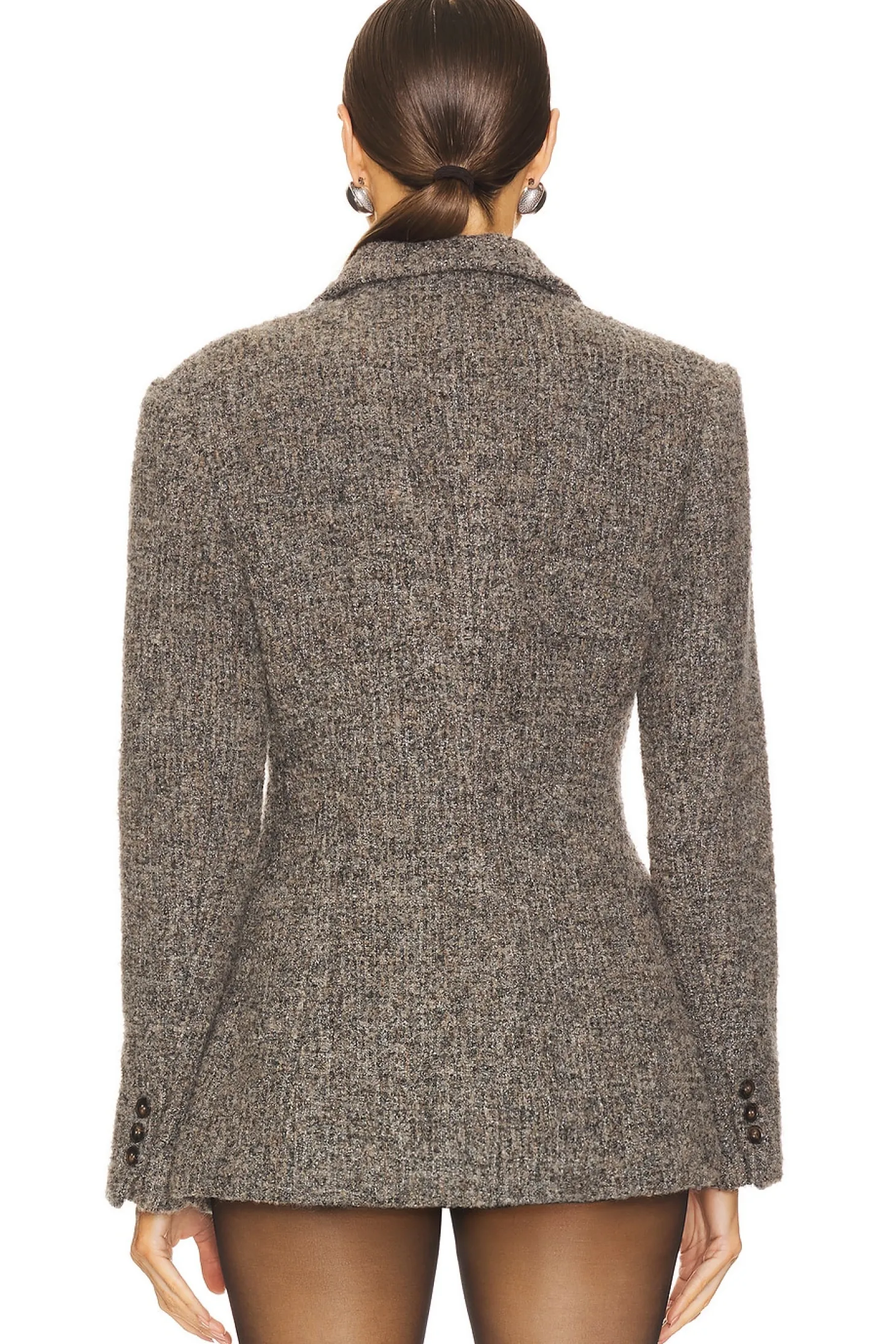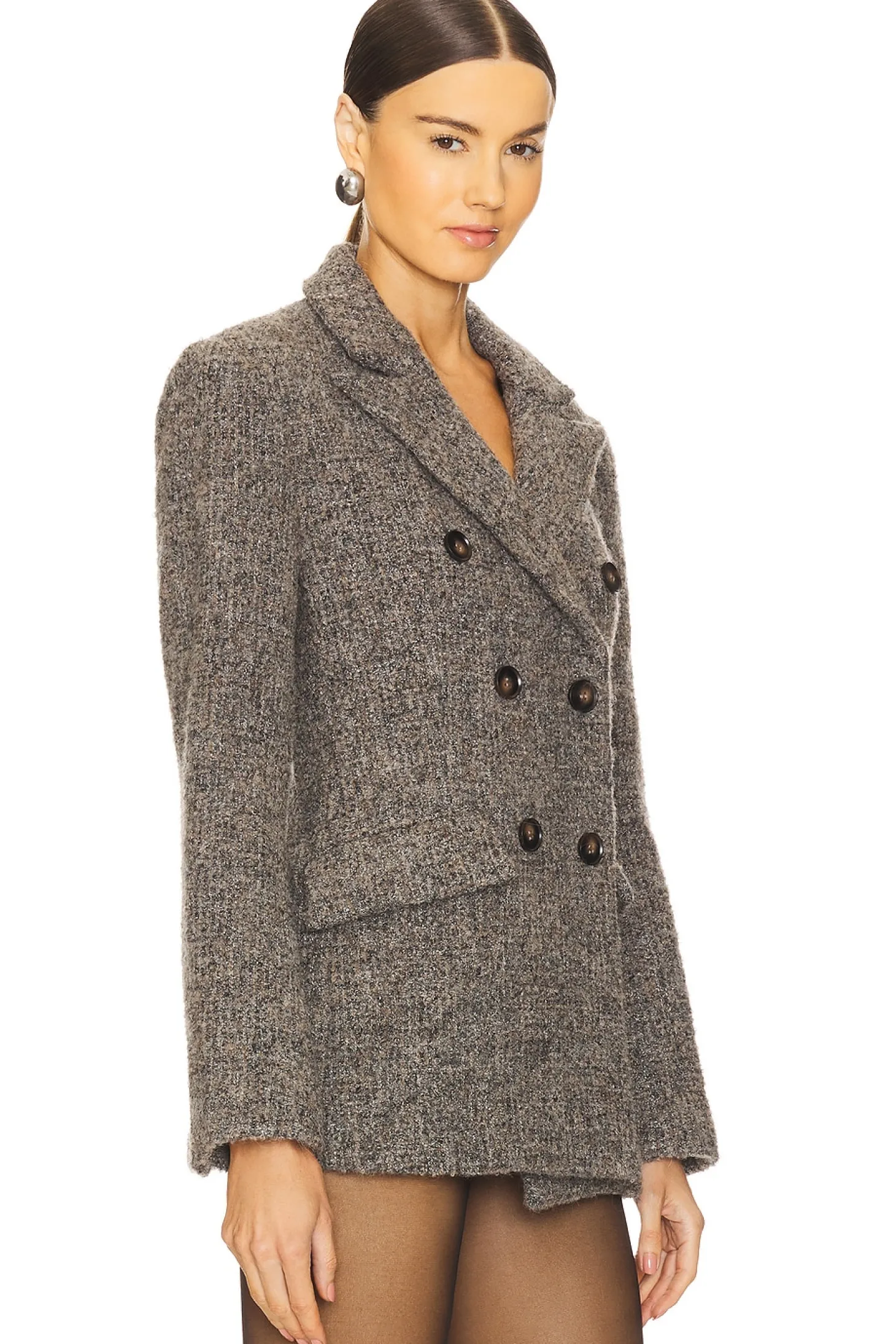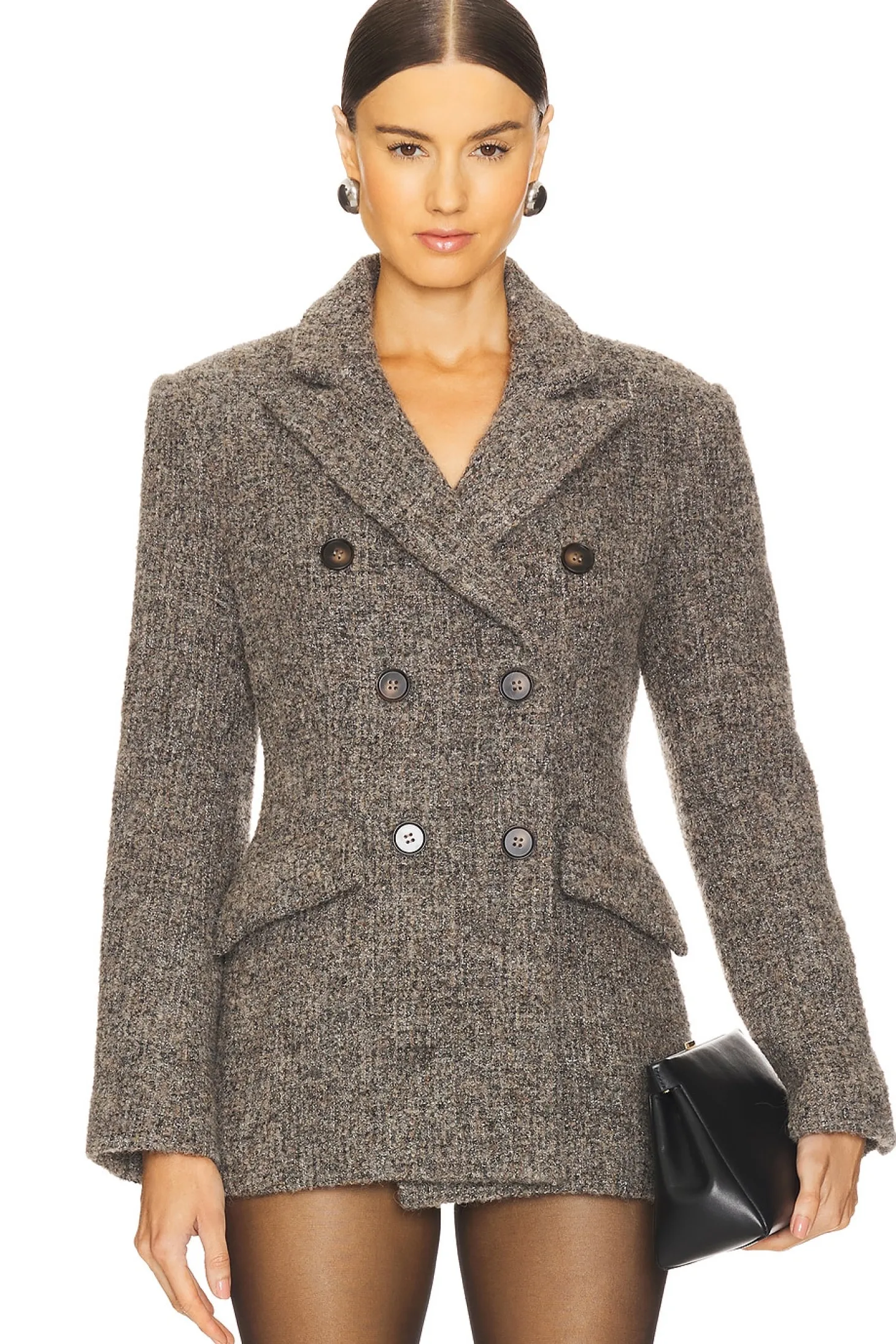 Self: 64% wool 20% polyester 10% acrylic 6% viscose Lining: 100% polyester.Made in China.Dry clean only.Double breasted closure.Front flap pockets.Buttoned cuffs.Midweight twill fabric with padded shoulders