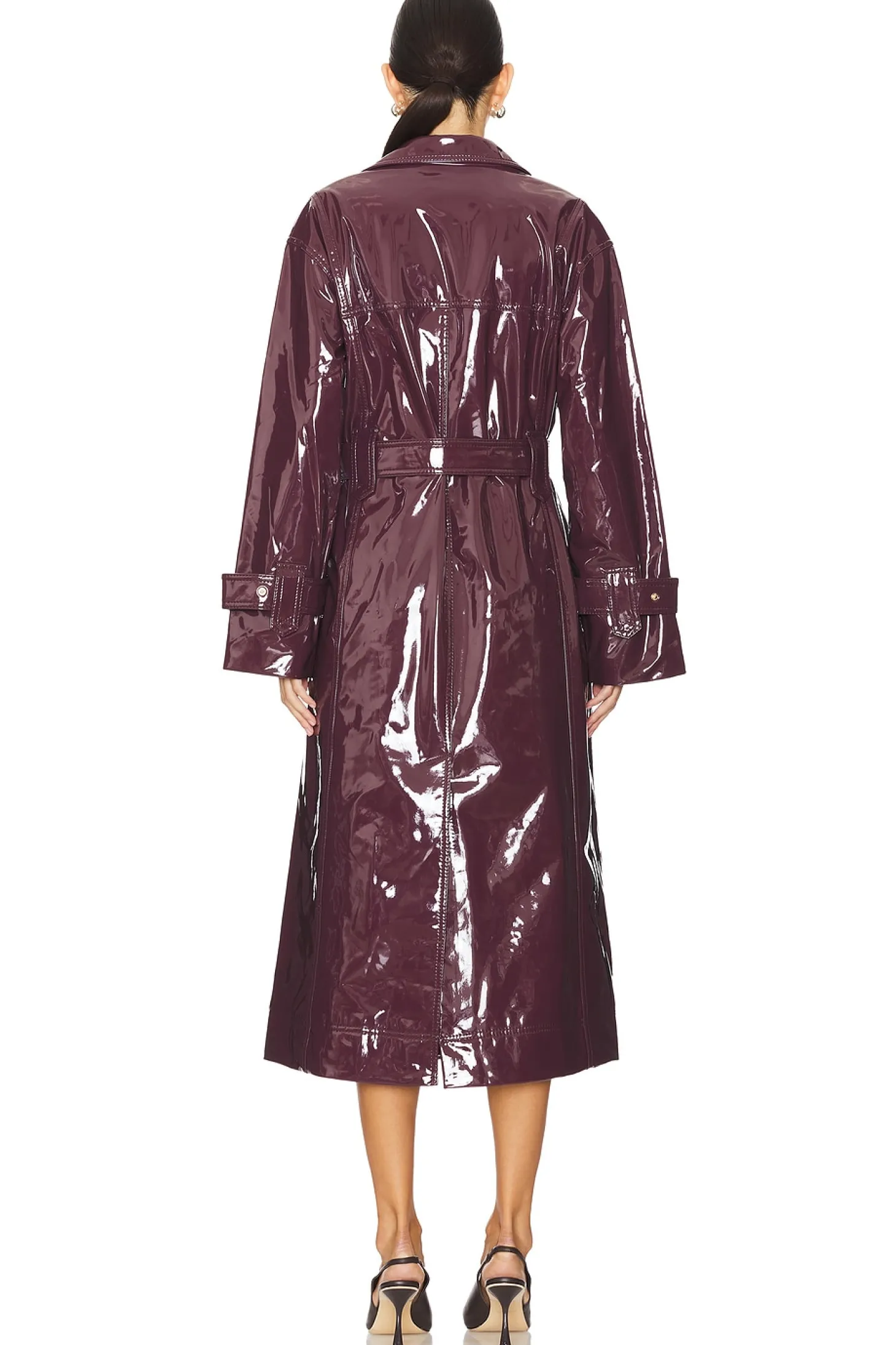 Self: 100% polyurethane Lining: 100% polyester.Made in China.Spot clean only.Optional tonal belt closure at waist.Side seam pockets.Belted cuffs with button snap closure.Faux patent leather with back vent