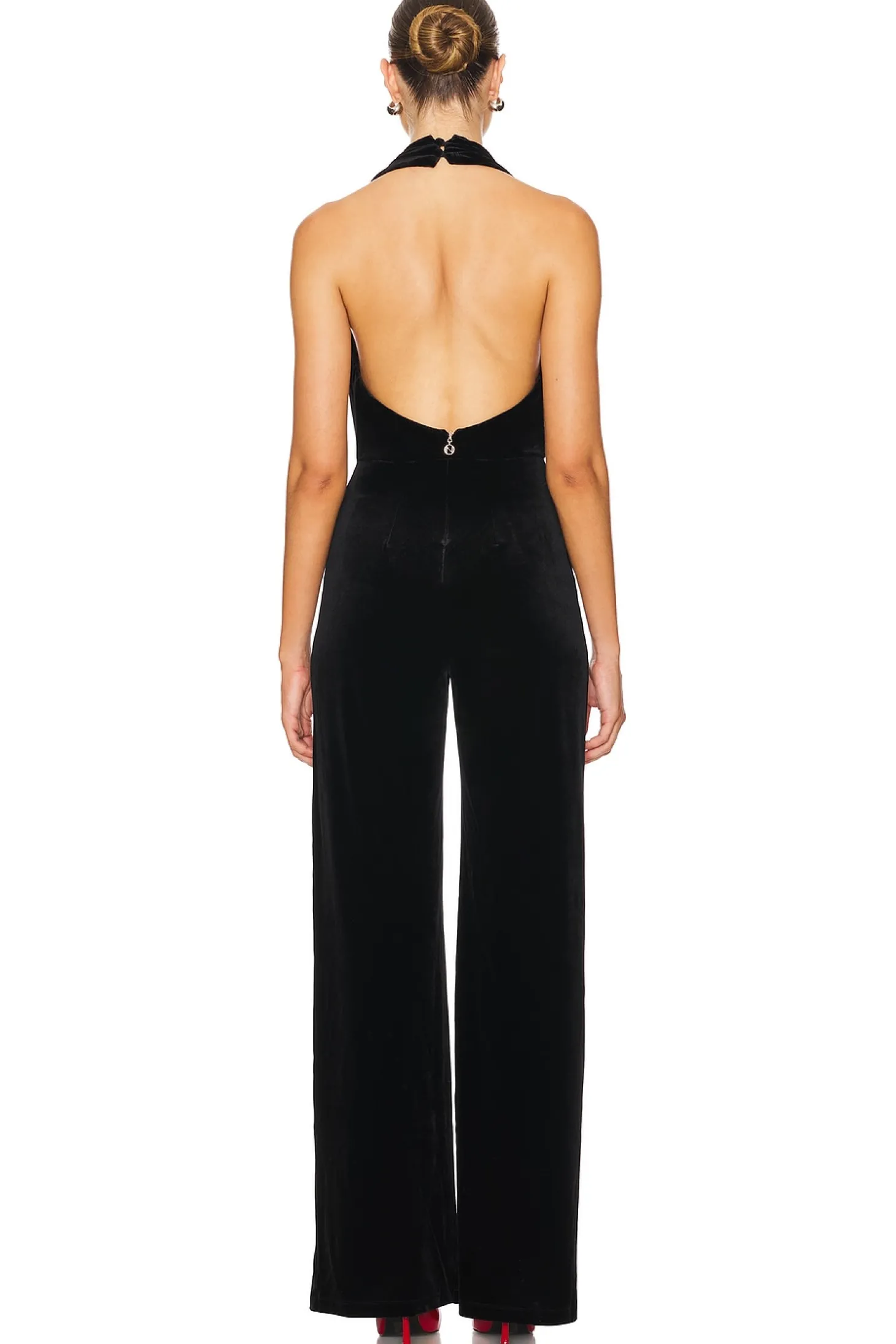 Self: 90% polyester 10% spandex Lining: 95% polyester 5% spandex.Made in Australia.Hand wash.Partial hidden side zipper closure.Halterneck with button closure.Lightweight velvet fabric