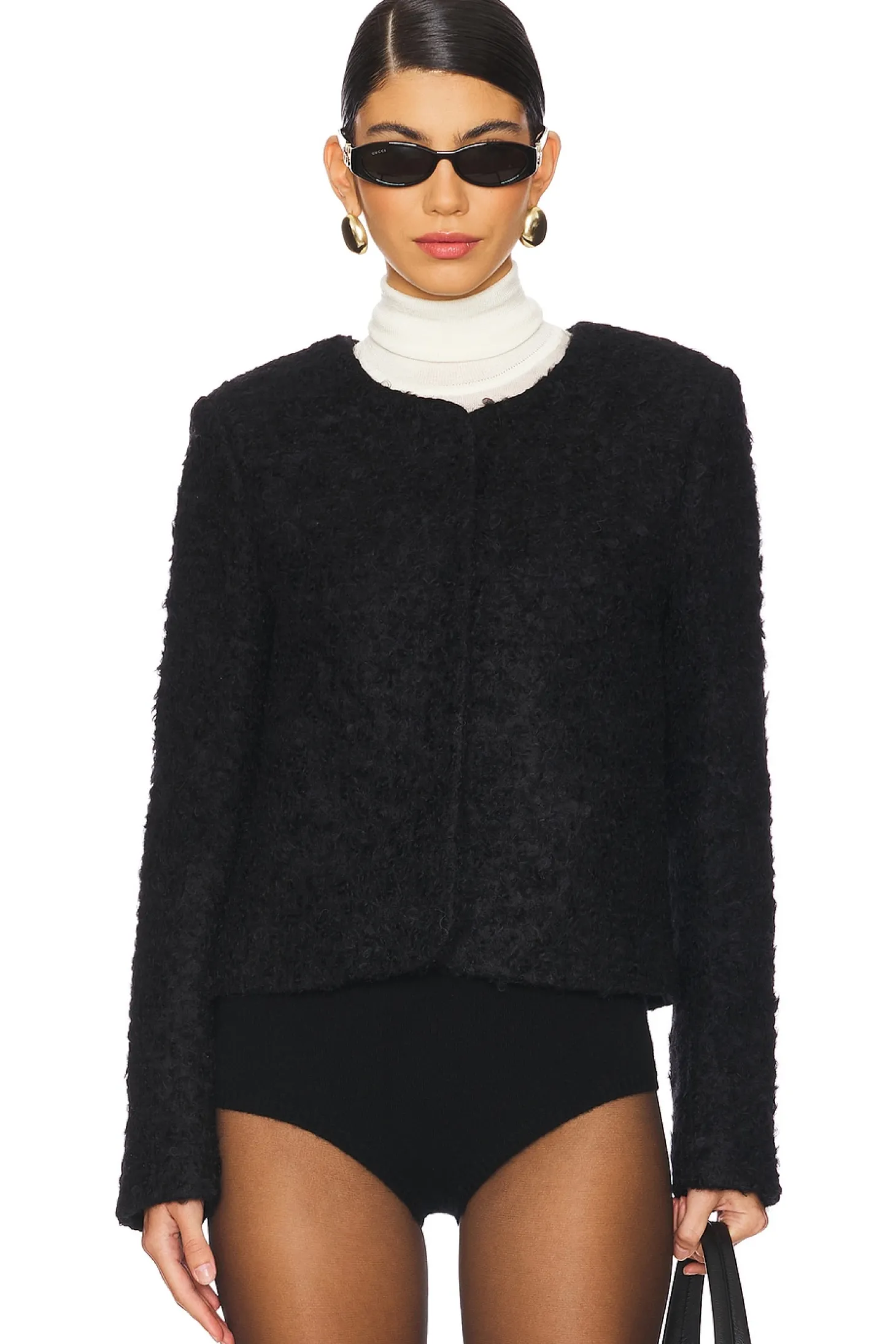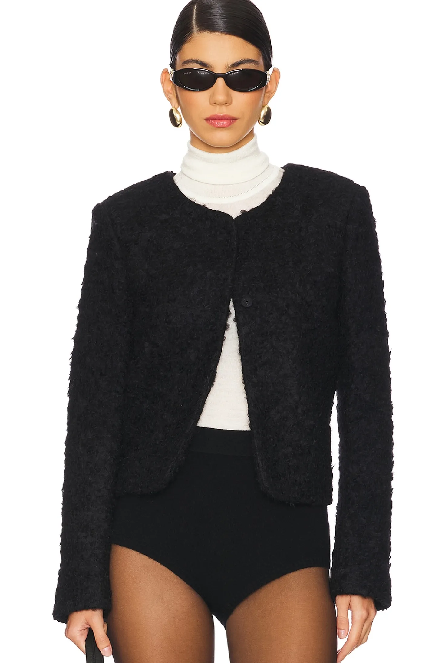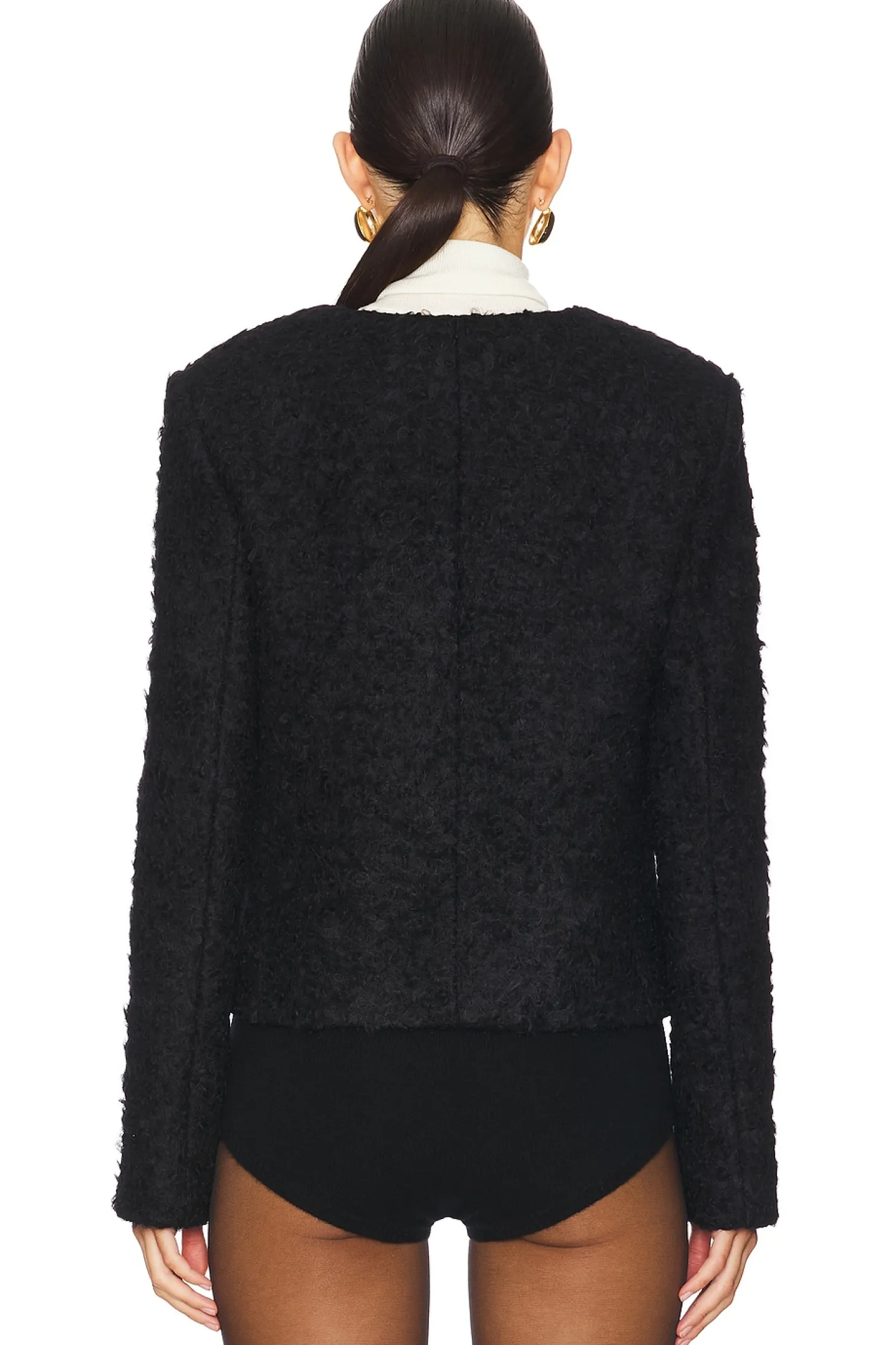 Self: 79% wool 17% polyamide 4% polyester Lining: 100% viscose.Made in Romania.Dry clean only.Front button closure.Padded shoulders.Midweight tweed fabric