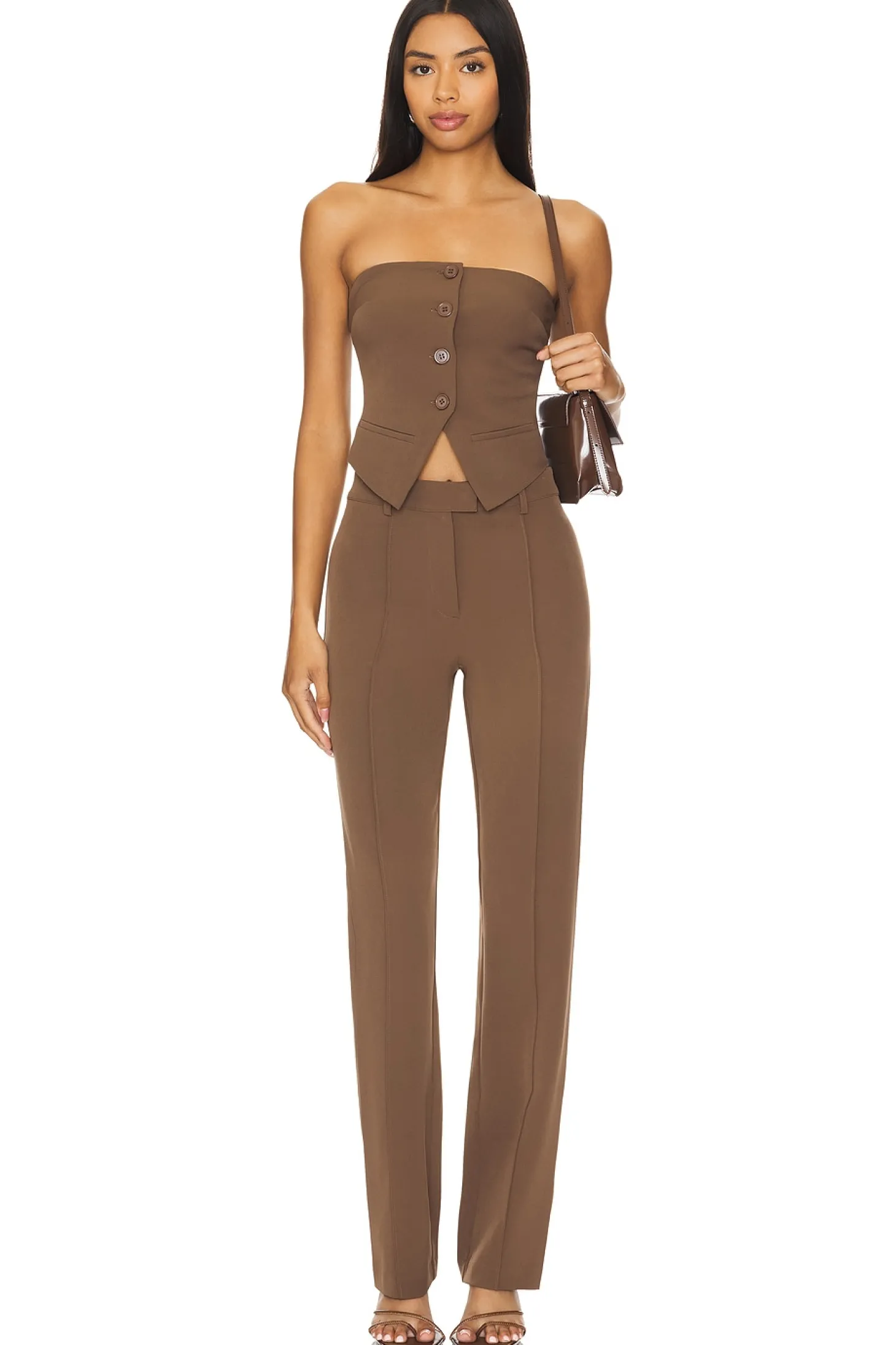 Self: 95% polyester 5% spandex Lining: 100% polyester.Made in China.Hand wash.Zip fly with button closure.Front button detail.Midweight suiting fabric.Sold as a set.Neckline to hem measures approx 57" in length 18" at the knee narrows to 15" at the leg opening