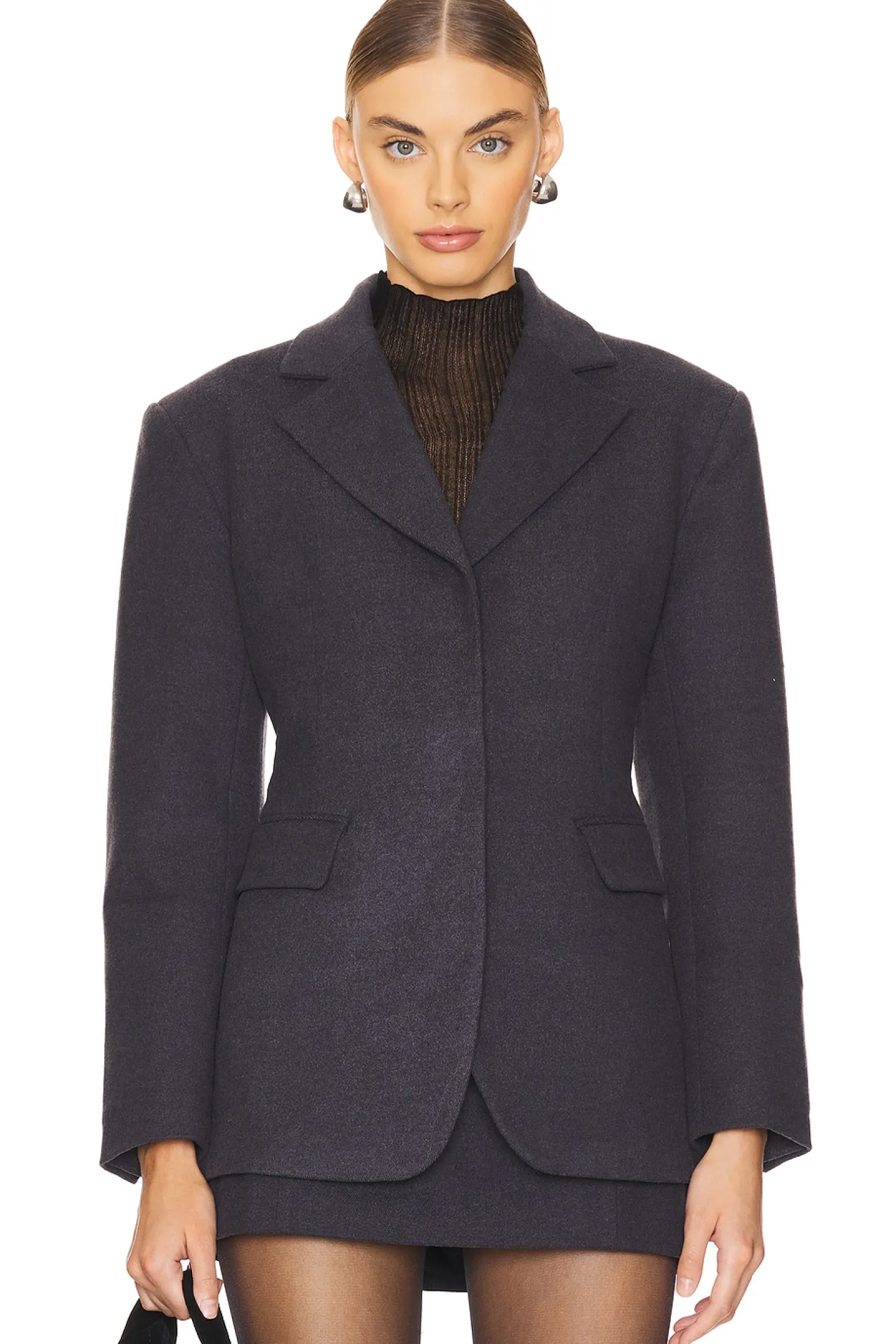 68% polyester 28% rayon 4% spandex.Made in China.Dry clean.Front button closure.Padded shoulders.Side flap pockets.Button cuffs.Melton fabric