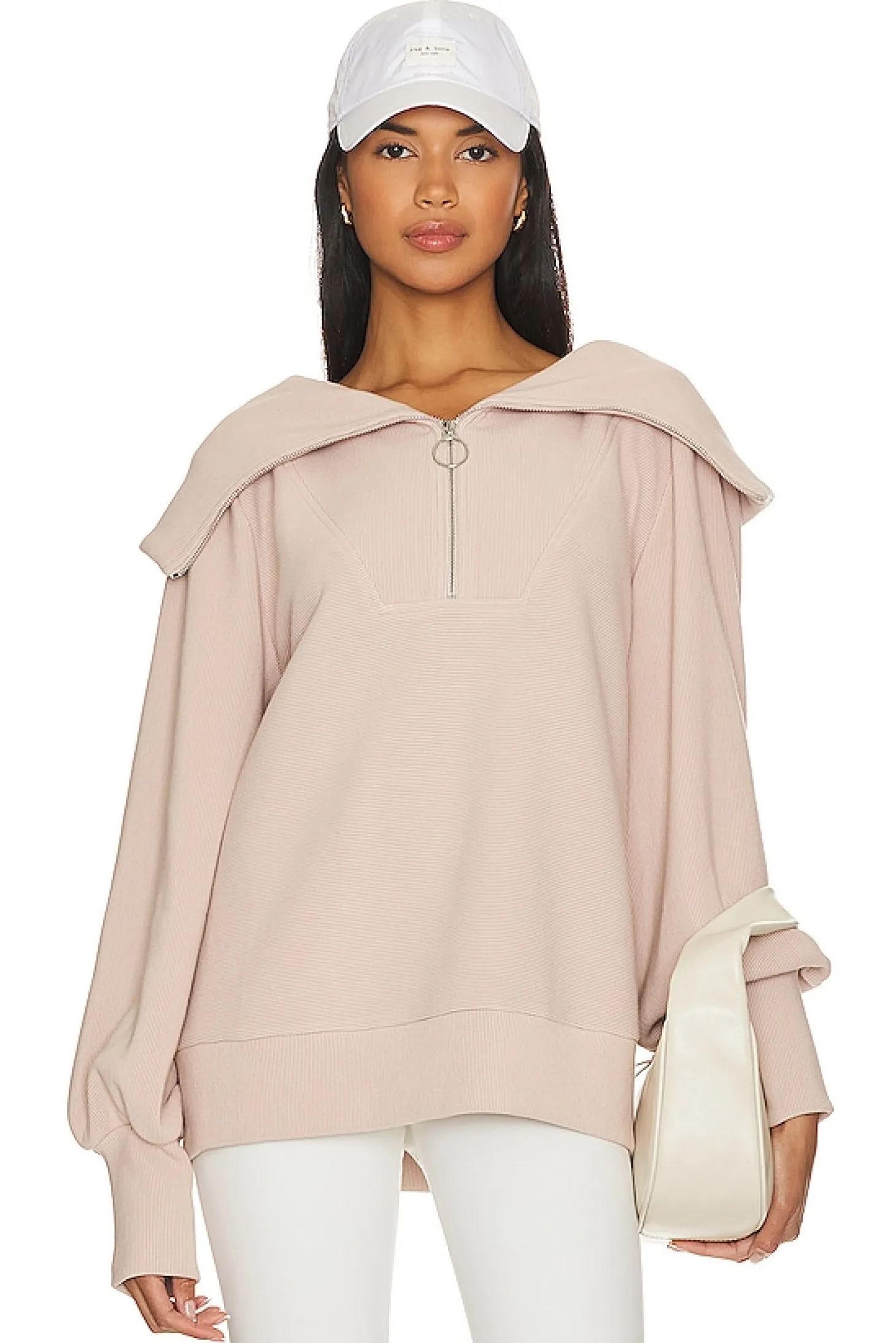 53% cotton 46% polyester 1% elastane.Made in China.Machine wash.Partial front zip closure.Exaggerated collar.Exaggerated sleeves.Ottoman rib fabric.Item not sold as a set