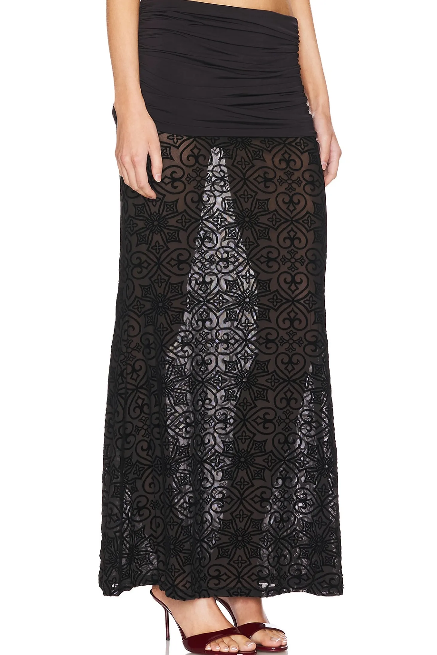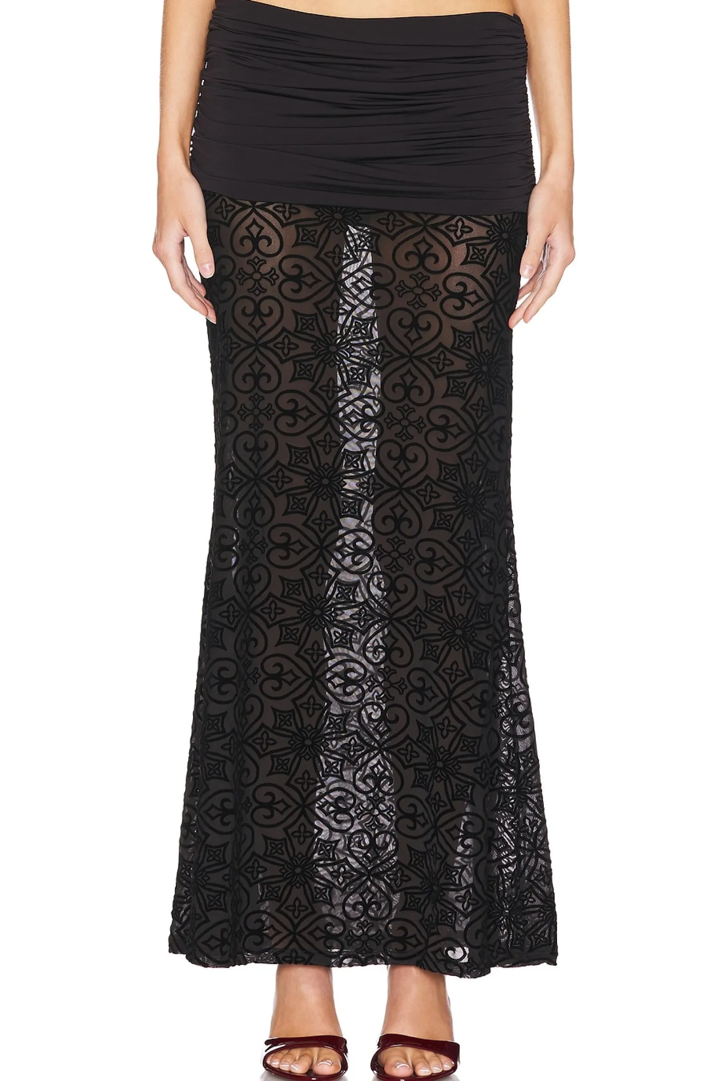 Self: 90% polyester 10% elastane Contrast Fabric: 93% polyester 7% elastane.Made in China.Dry clean only.Partially lined.Pull-on styling with elastic waistband.Ruched jersey waist and mesh skirt with velvet pattern detail.Item not sold as set Garment is made with a semi-sheer fabric, undergarments can show through.Skirt measures approx 41" in length
