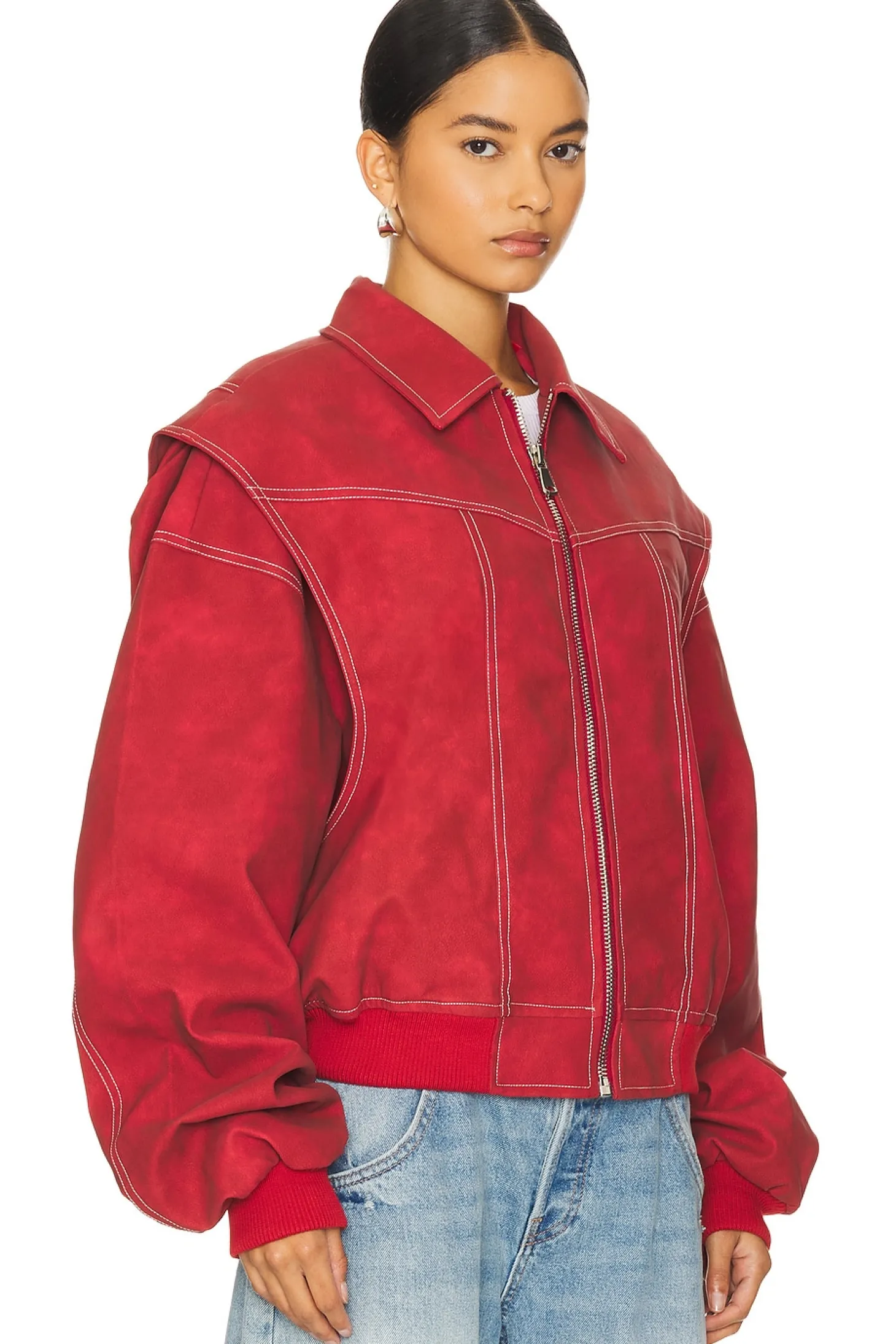 55% polyurethane 45% polyester.Made in China.Hand wash.Exposed front zip closure.Side seam pockets.Ribbed cuffs and hem.Faux suede