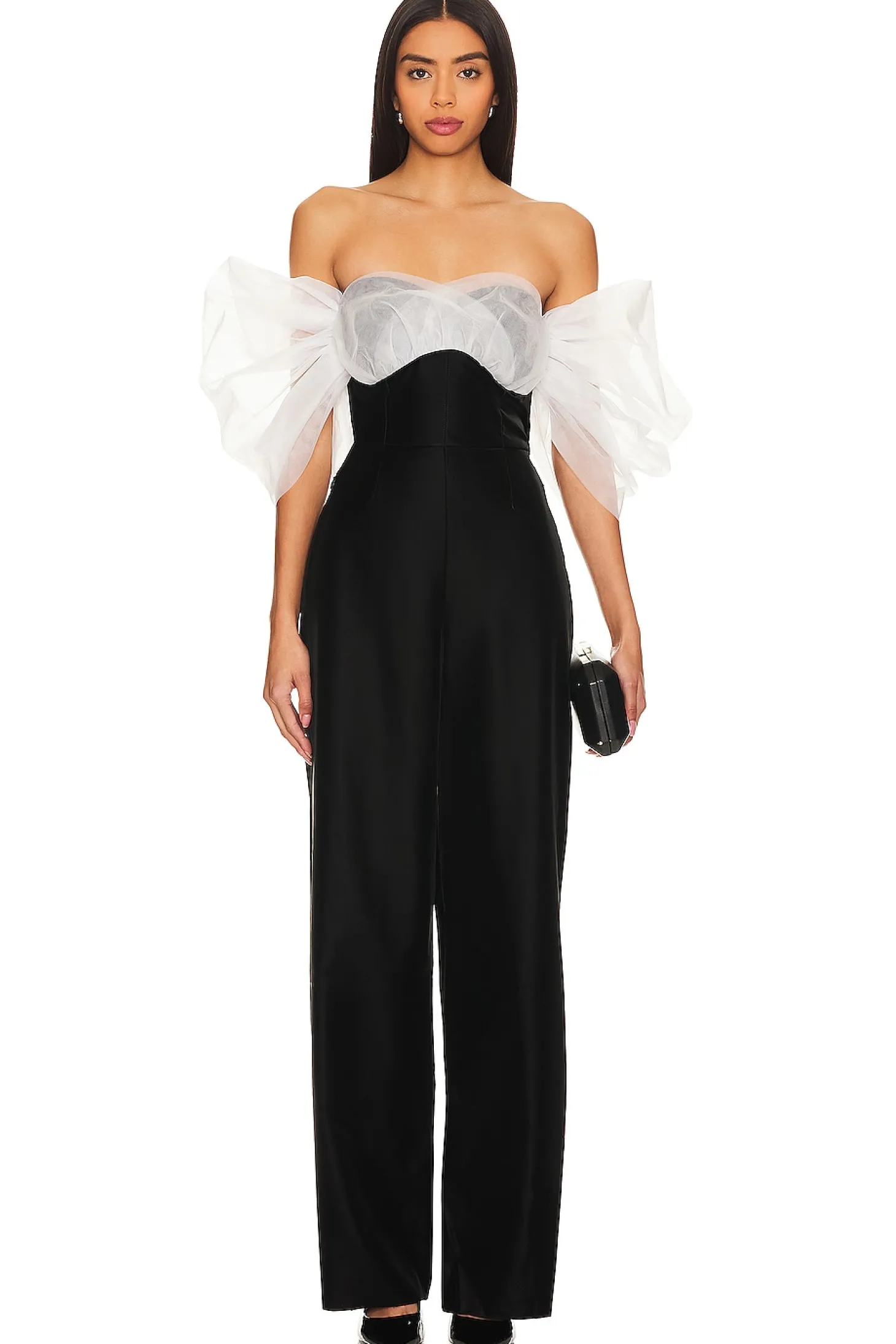 Self 1: 100% polyurethane Self 2: 100% viscose Lining: 95% polyester 5% elastane Contrast Fabric: 100% polyester.Made in China.Dry clean only.Hidden side zipper closure.Padded cups and boned sides.Off-the-shoulder tulle puff sleeves Side zipper pockets.Smooth faux leather with tulle bust.Neckline to hem measures approx 53" in length 22" at the knee narrows to 20" at the leg opening