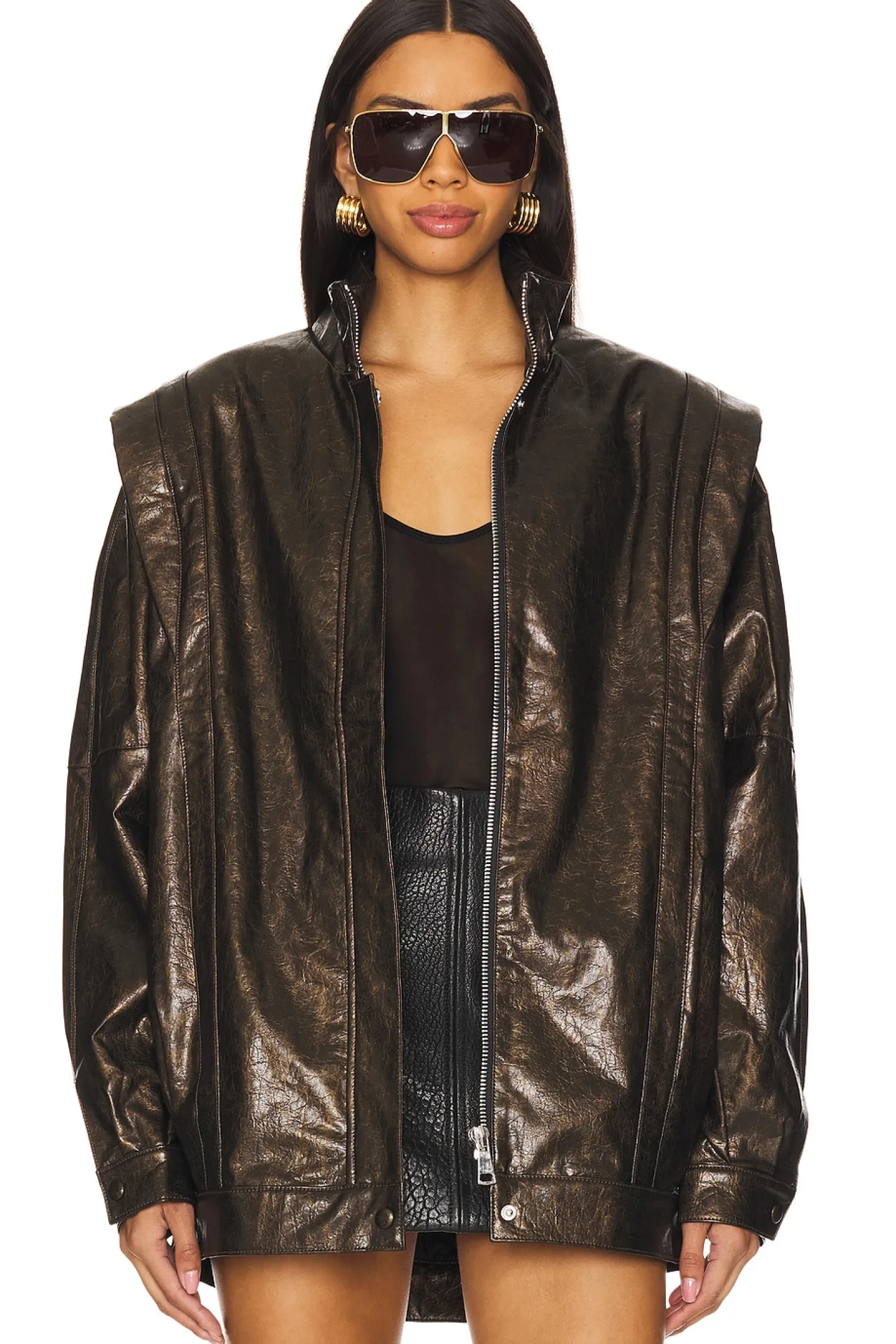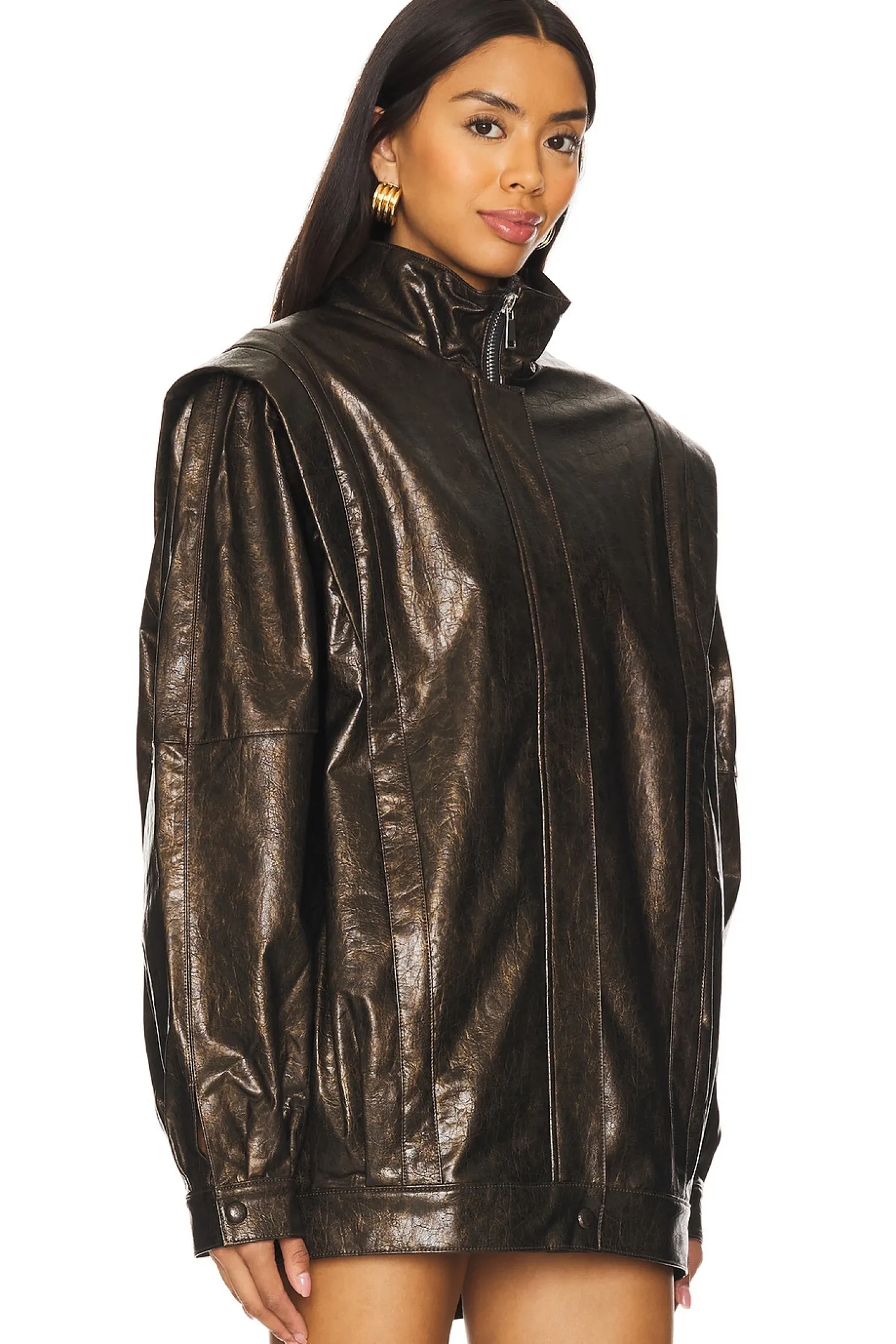 Self: 50% polyurethane 50% viscose Lining: 55% viscose 45% polyester.Made in China.Dry clean only.Front zip with snap closure.Side seam pockets Button cuffs.Heavyweight faux leather fabric