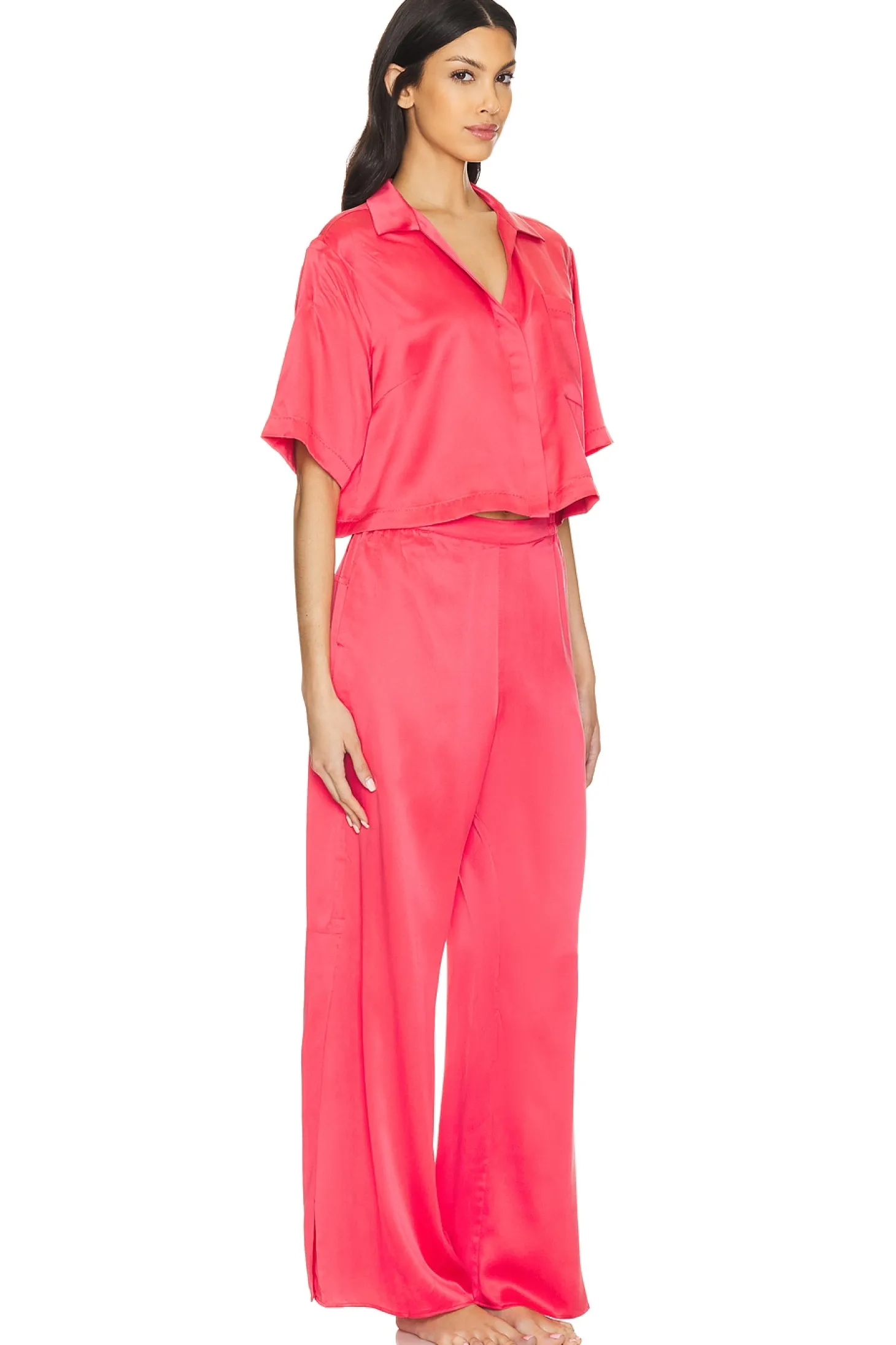 100% silk.Made in China.Machine wash.Top front button closure.Top breast pocket.Bottoms elastic waistband.Bottoms side pockets.Jersey knit silk fabric