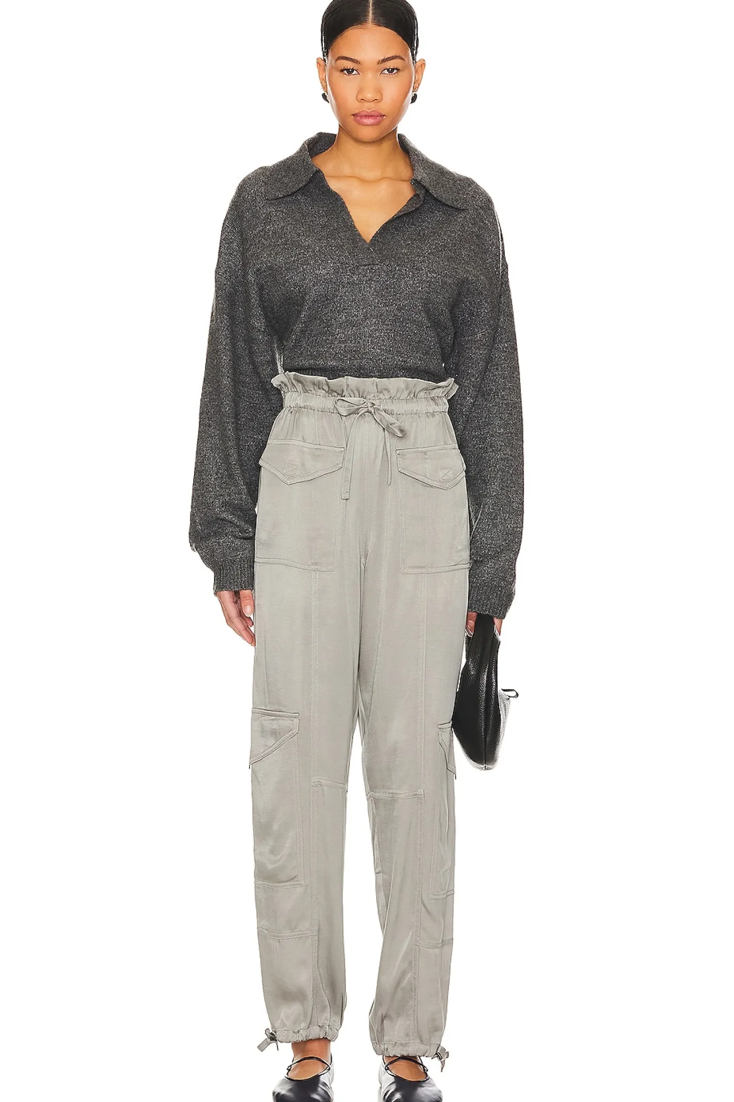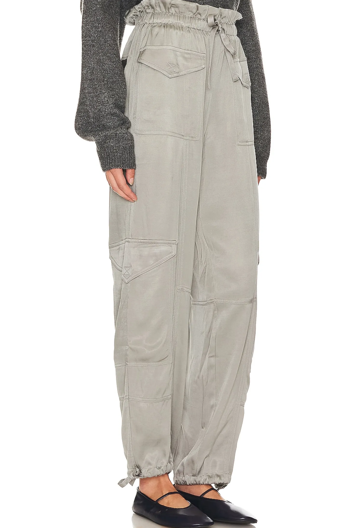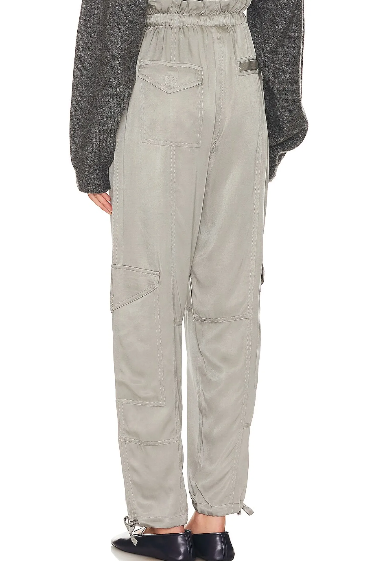 50% ECOVERO viscose 50% cupro.Made in China.Machine wash.Drawstring paperbag waist tie closure.6-pocket styling includes two cargo button pockets.Satin fabric with paperbag waist.22" at the knee narrows to 14" at the leg opening