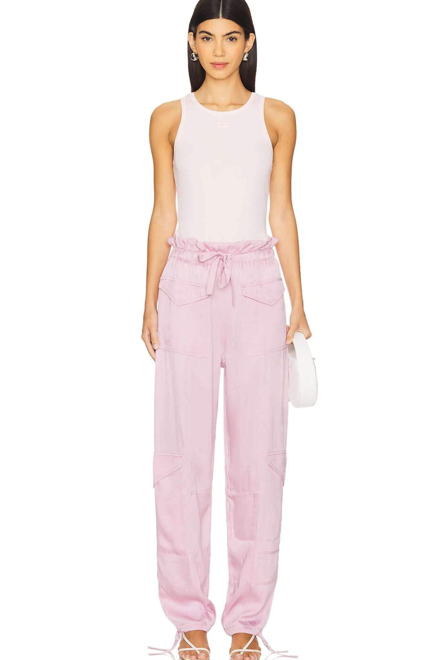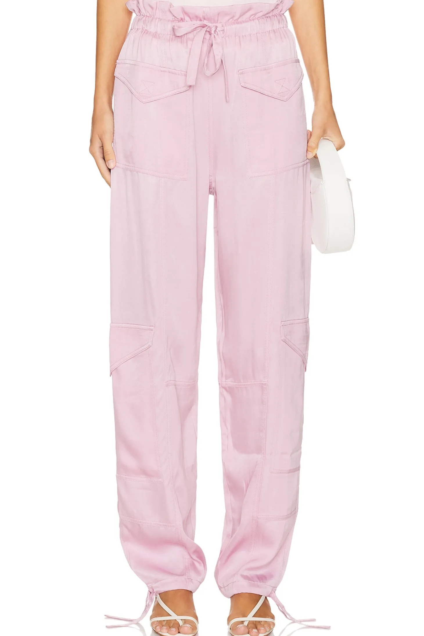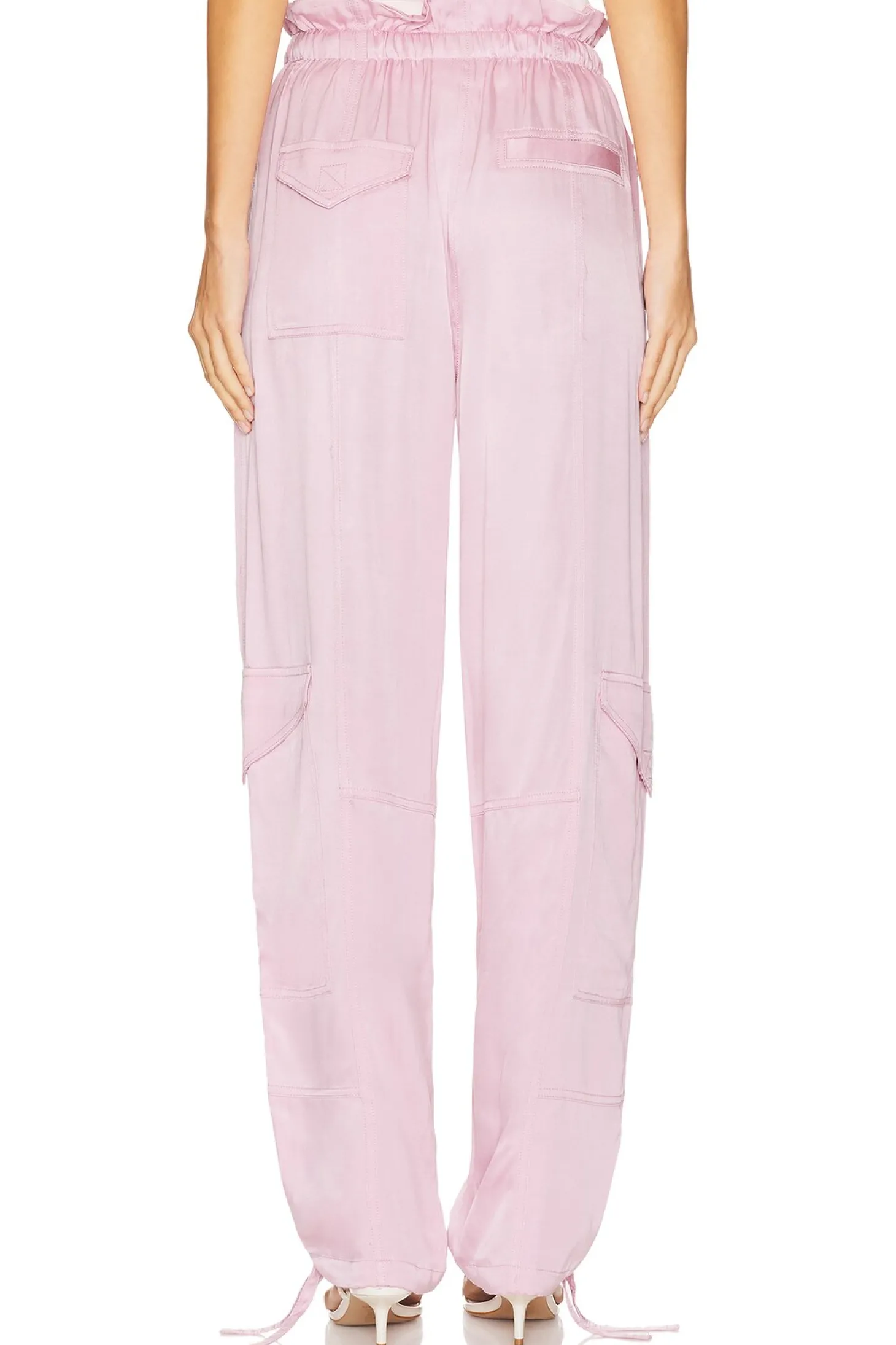 50% viscose 50% cupro.Made in China.Machine wash.Pull-on styling with elastic waistband and drawstring.6-pocket cargo design.Adjustable tie at ankles.Satin fabric.20" at the knee narrows to 14" at the leg opening