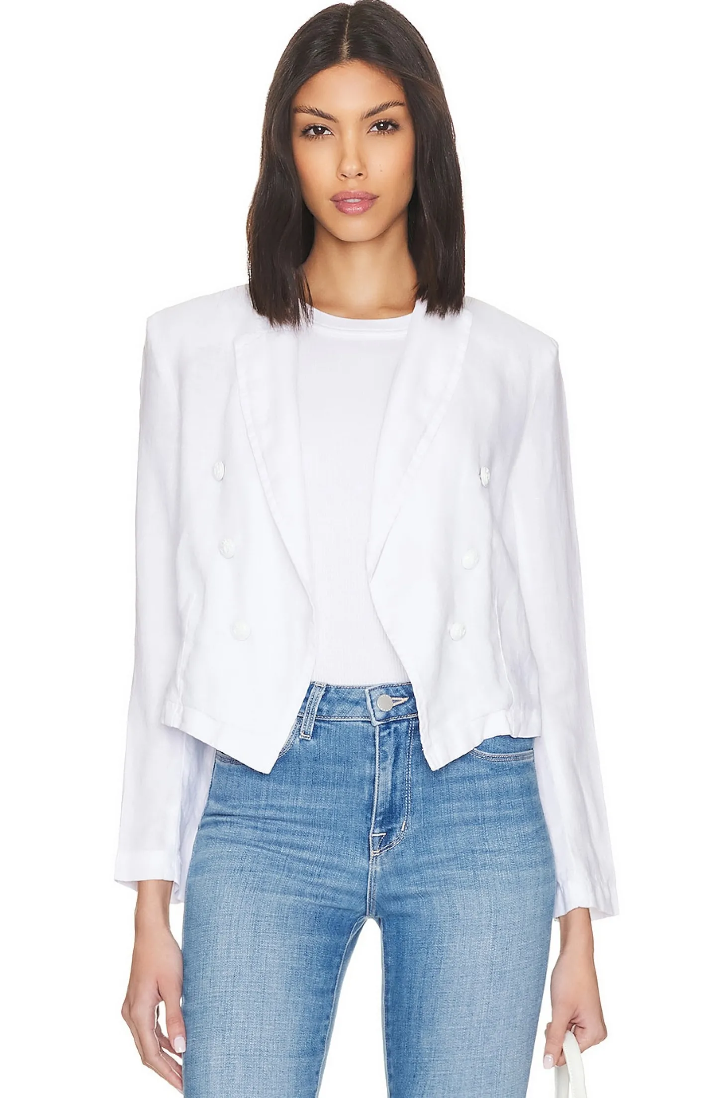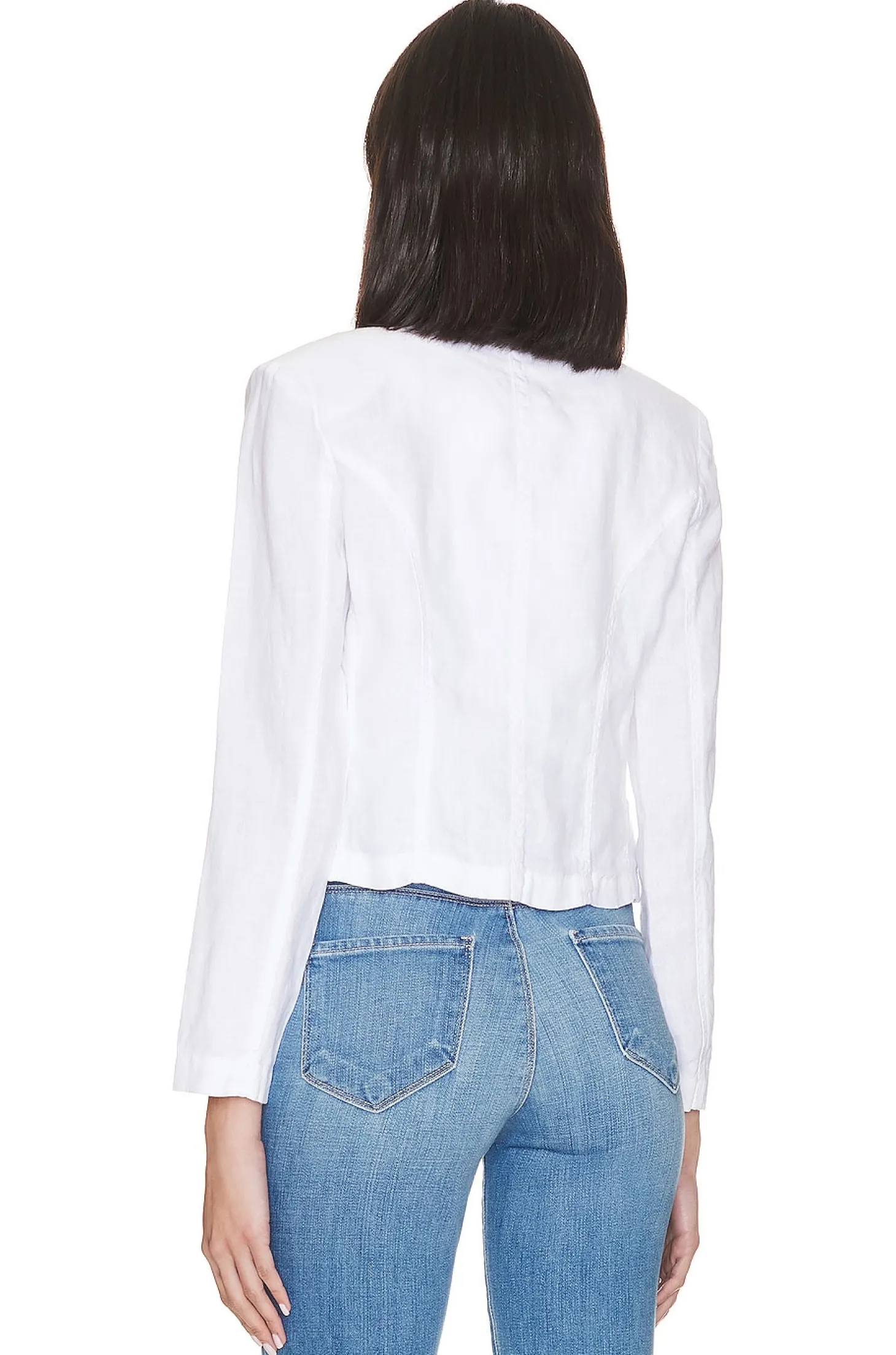 Cotton blend.Imported.Dry clean recommended.Front button closure.Padded shoulders.Lightweight linen fabric
