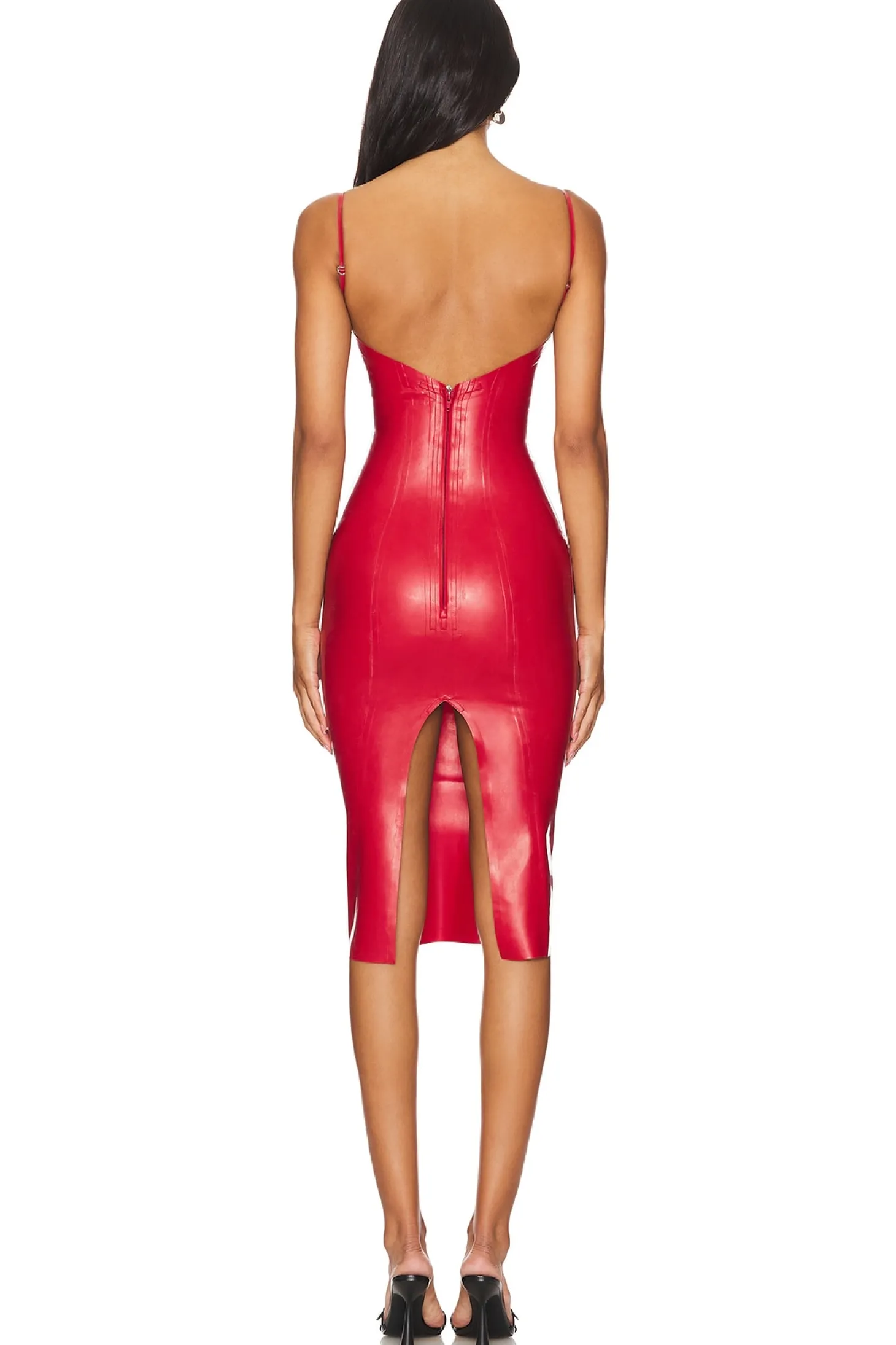 100% latex.Made in China.Hand wash.Unlined.Back zipper closure.Adjustable shoulder straps.Latex with back slit