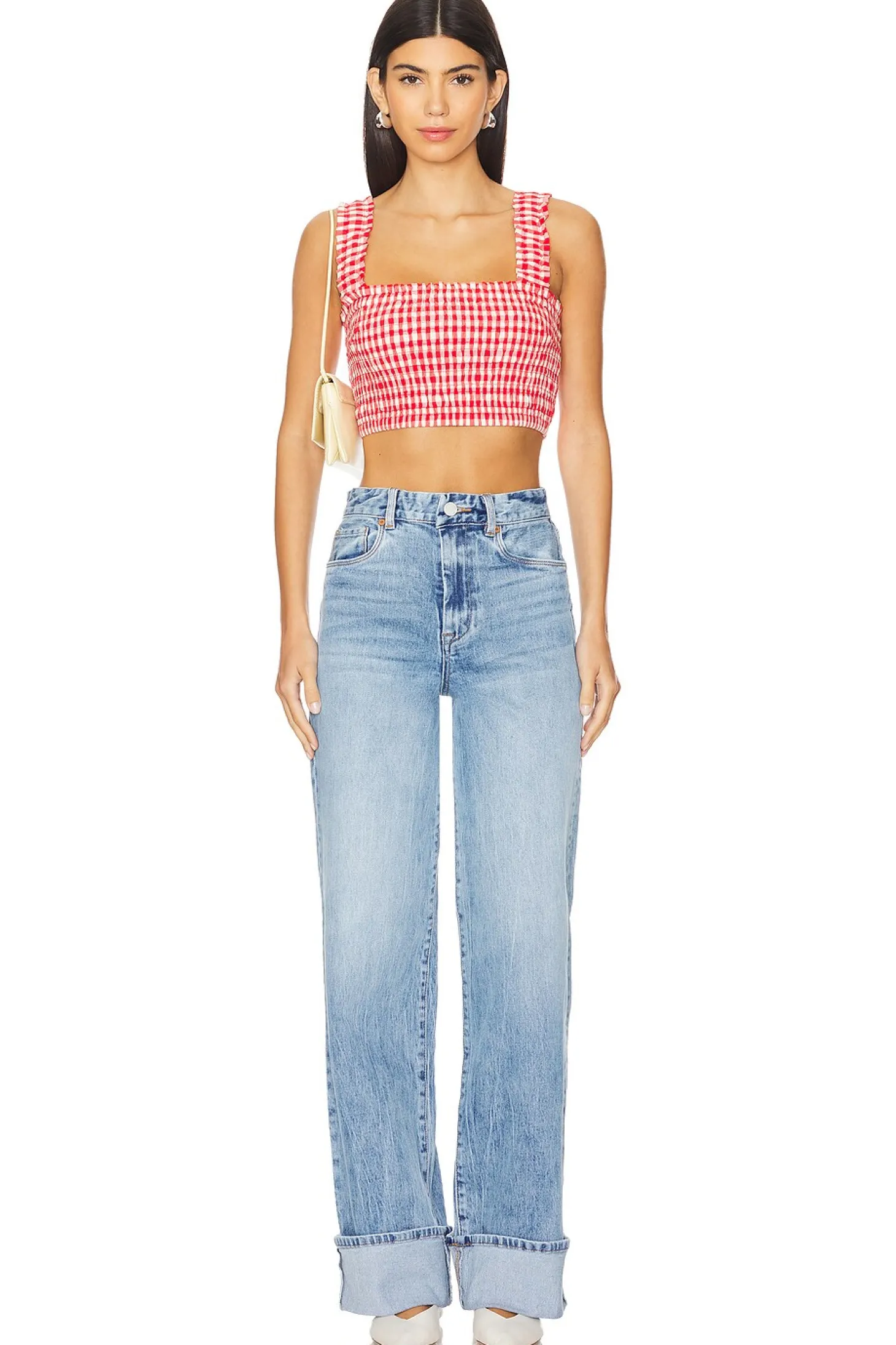 99% cotton 1% spandex.Made in China.Machine wash.Zip fly with button closure.5-pocket design.Light whiskering and fading detail.Folded cuffs.20" at the knee narrows to 19" at the leg opening