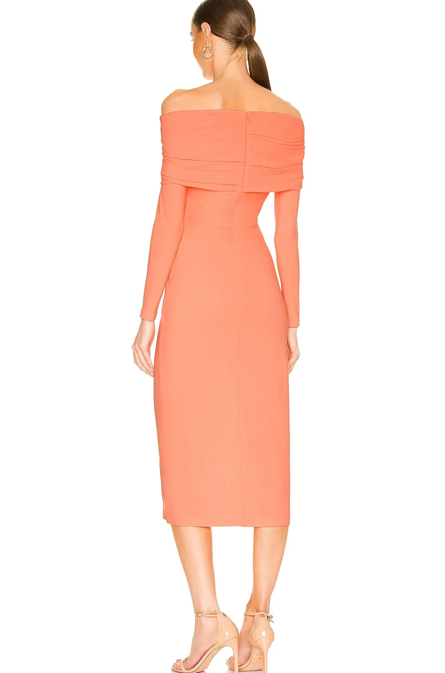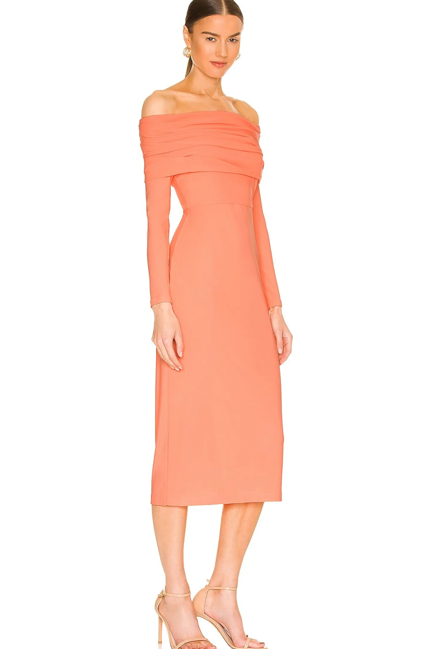 96% poly 4% elastane.Made in China.Dry clean only.Unlined.Hidden back zipper closure.Off-shoulder styling with ruched fabric detail.Crepe fabric