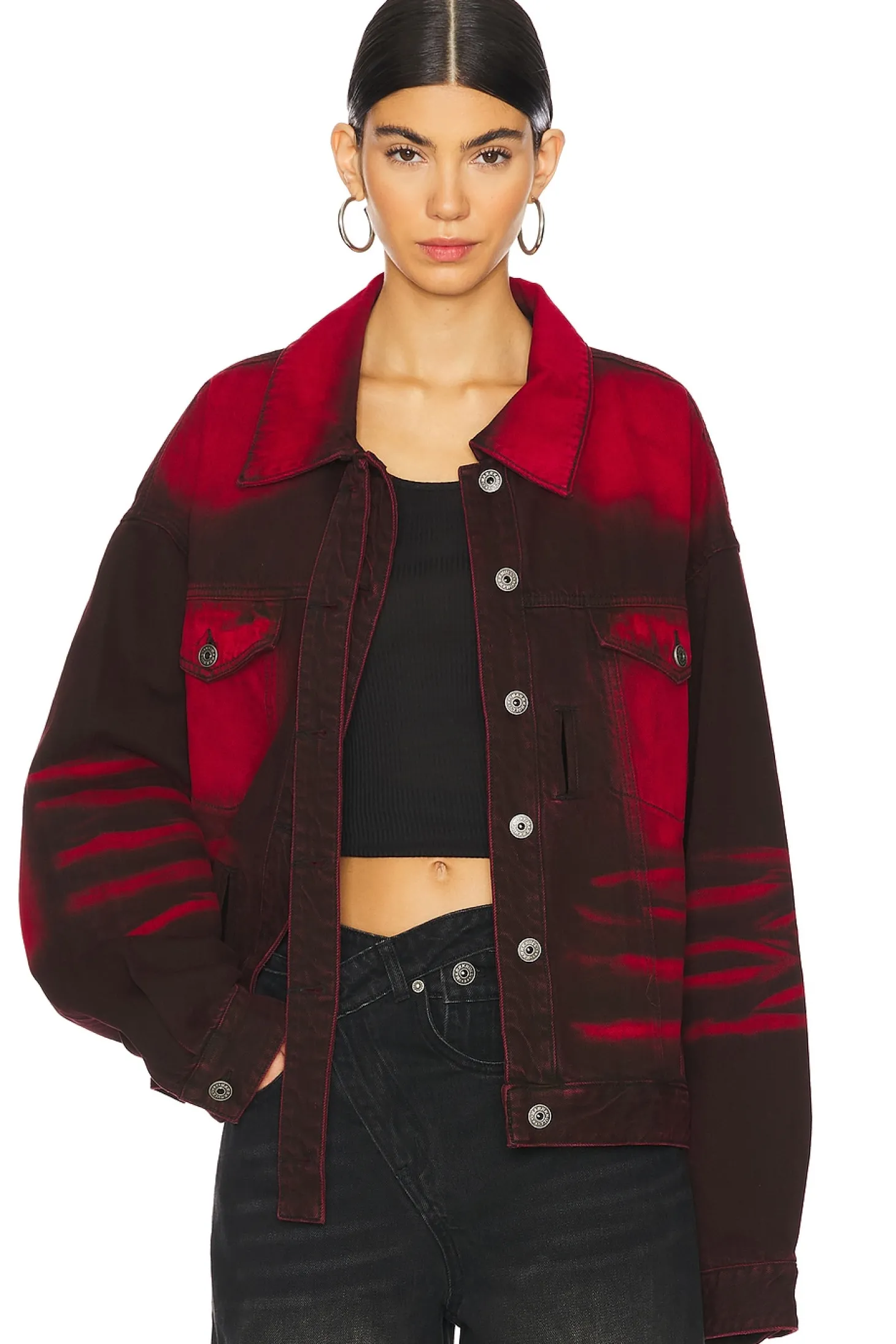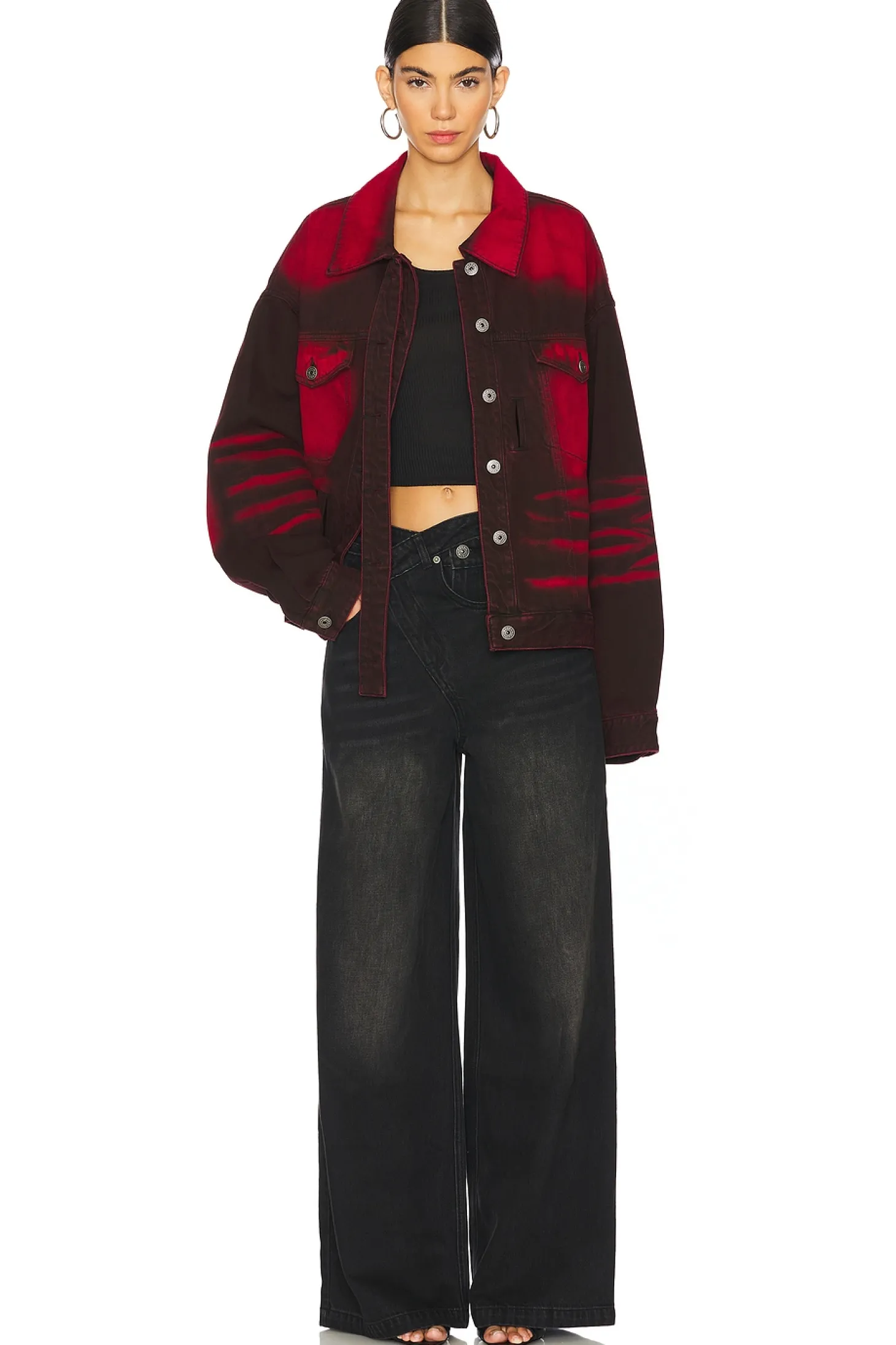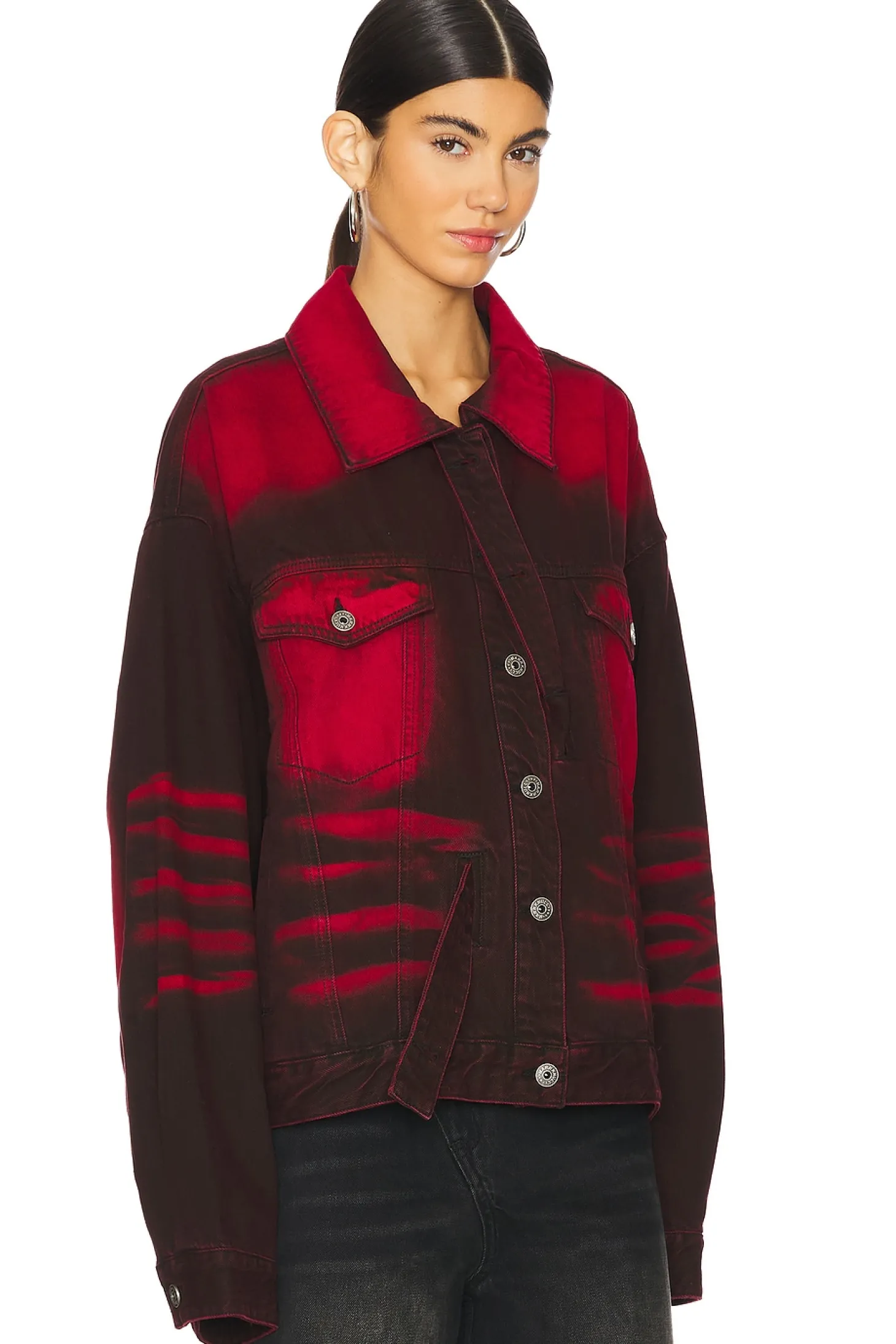 100% cotton.Made in China.Machine wash.Front button closure.Front slant welt pockets and breast button pockets Denim belt detail.Heavyweight denim fabric with intentional bleaching throughout