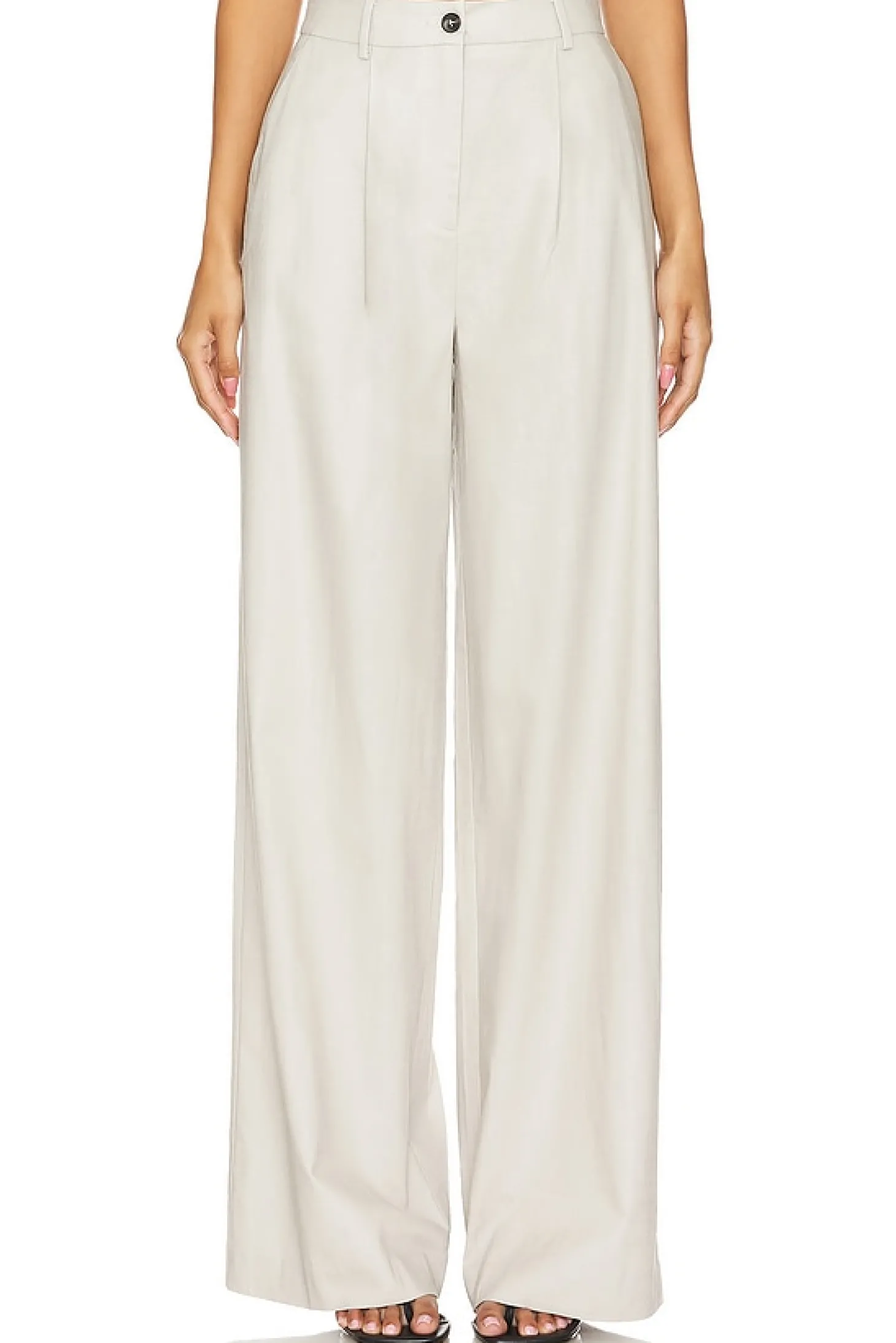65% viscose 32% linen 3% elastane.Made in China.Hand wash.Front fly zip with button closure.Front side seam pockets and back faux welt pockets.Lightweight linen fabric.24" at the knee narrows to 23" at the leg opening
