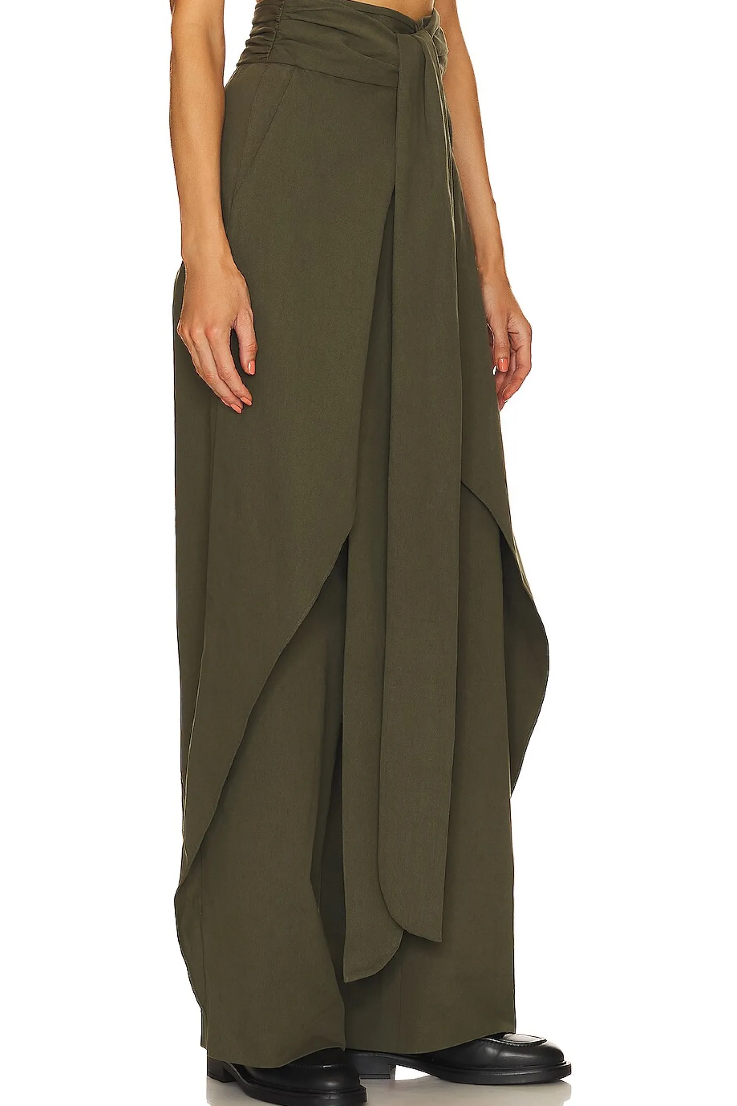 The Molnm Combat Wrap Trousers in Green, designed by Portuguese architect and AI fashion week winner Matilde, are a unique and distinctive piece of clothing. These trousers feature an attached waist tie closure with a draped design, which adds a touch of individuality and style to your outfit. They are made from twill fabric, making them durable and suitable for various occasions..100% cotton.Made in USA.Machine wash.Zip fly with hook and bar closure.Attached waist tie closure with draped design.Twill fabric.22" at the knee and 22" at the leg opening
