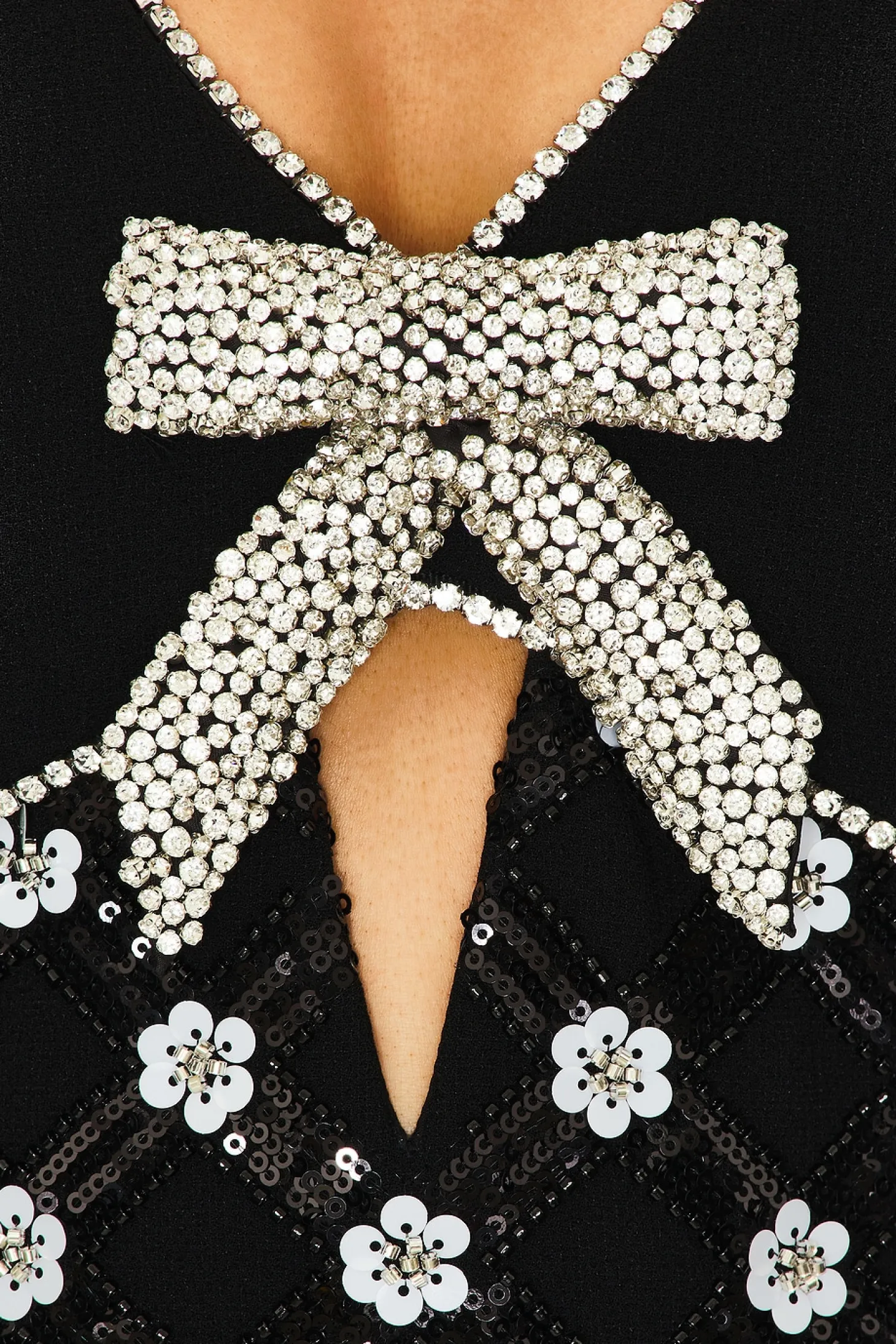 Self: 98% polyester 2% elastane Lining: 97% polyester 3% elastane.Made in China.Dry clean only.Fully lined.Exposed back zipper closure.Puff sleeve design and stone trim.Crepe fabric and sequin embellished skirt