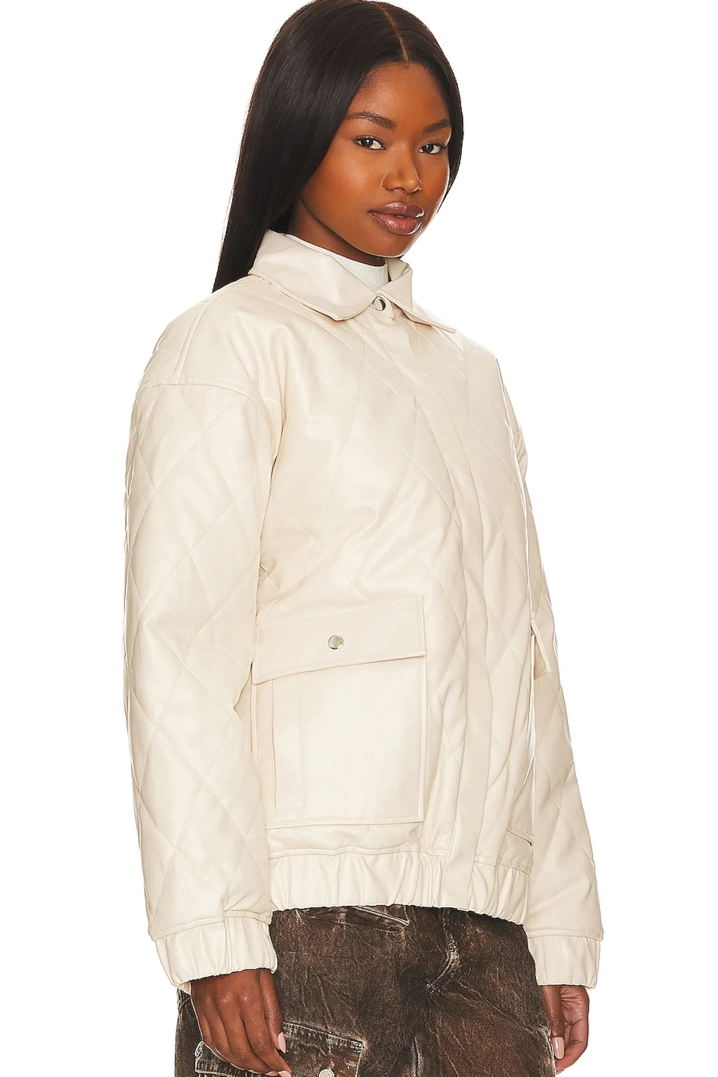 Elevate your winter wardrobe with the Lovers + Friends Rylee Faux Leather Jacket in elegant ivory. Crafted from quilted faux leather, it's the perfect piece to stay warm and stylish in cold weather..Self: 100% polyurethane Back: 90% polyester 8% cotton 2% viscose Lining: 97% polyester 3% spandex Filling: 100% polyester.Made in China.Dry clean only.Front snap button closure.Side flap pocket with snap button closure.Elastic cuffs and hem.Quilted faux leather fabric