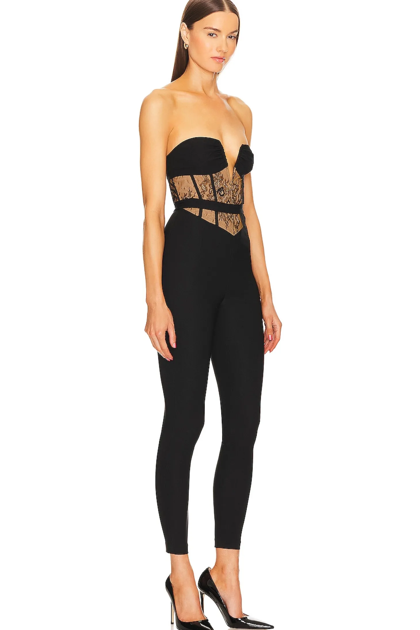 Meet the perfect black jumpsuit for the girl who travels in luxury- the Michael Costello x REVOLVE Billie Jumpsuit in Black. With a wired plunge neckline and lace bustier styling, it's your go-to for nights out in any town. Pack this piece for party perfection wherever the fun takes you- because fabulous is always on the itinerary..Self: 63% rayon 33% nylon 4% spandex Contrast Fabric: 100% nylon Lining: 90% polyester 10% spandex.Made in China.Hand wash.Hidden back zipper closure.V-wire front with boned bodice.Lace fabric overlay at bodice Crepe jersey fabric.Neckline to hem measures approx 48" in length 12" at the knee narrows to 8" at the leg opening