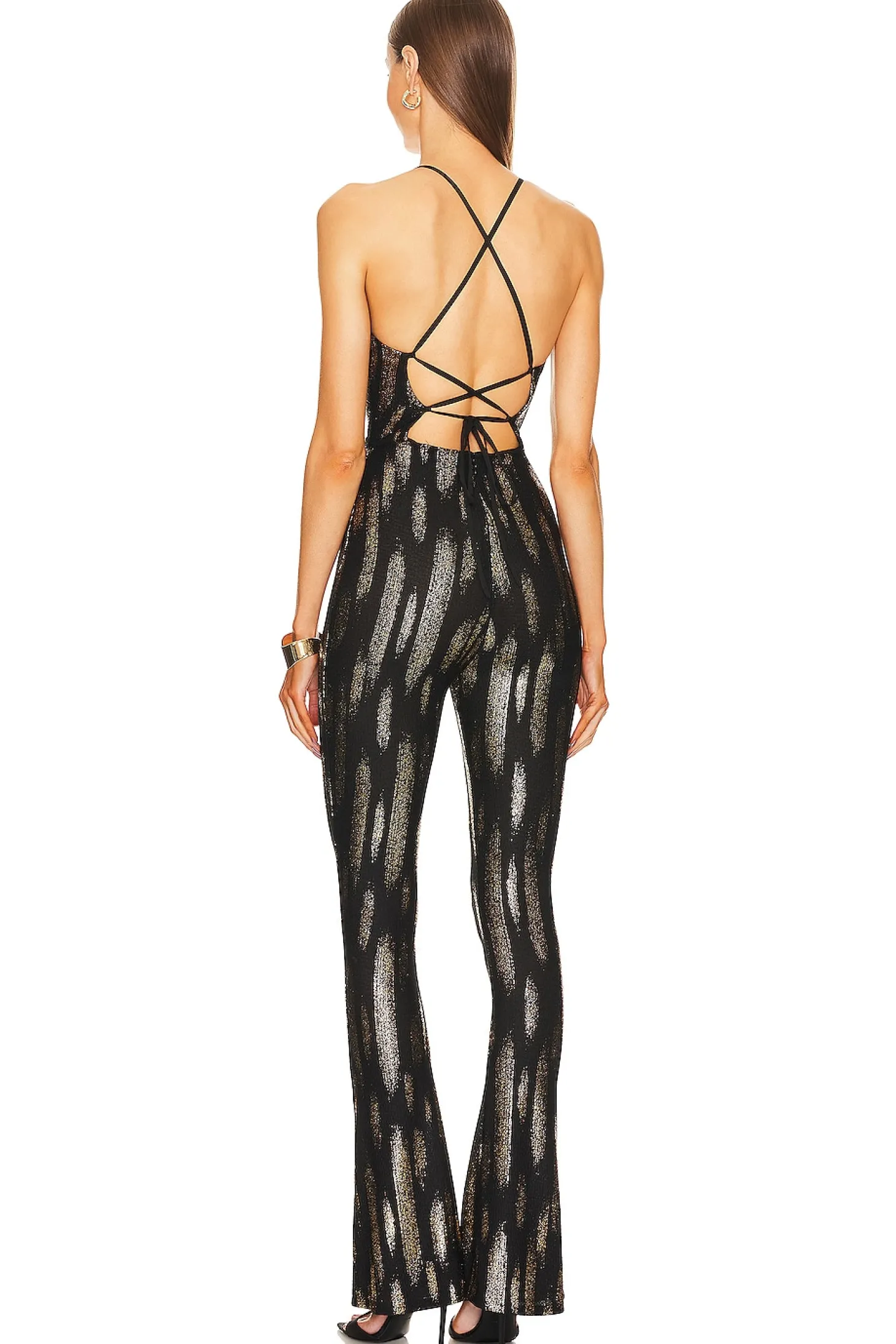 Make a statement in the Michael Costello x REVOLVE Jayne Jumpsuit in Black Gold. This jumpsuit is not just an outfit; it's a head-turning piece designed to captivate attention on every occasion. The retro-inspired flare silhouette, plunging neckline, and lace-up back add a touch of drama and sophistication, creating a stunning look that's perfect for making an entrance..Self: 95% polyester 5% spandex Lining: 92% polyester 8% spandex.Made in Philippines.Hand wash.Open back with crisscross back tie closure.Jersey fabric with gold-tone metallic threading detail throughout