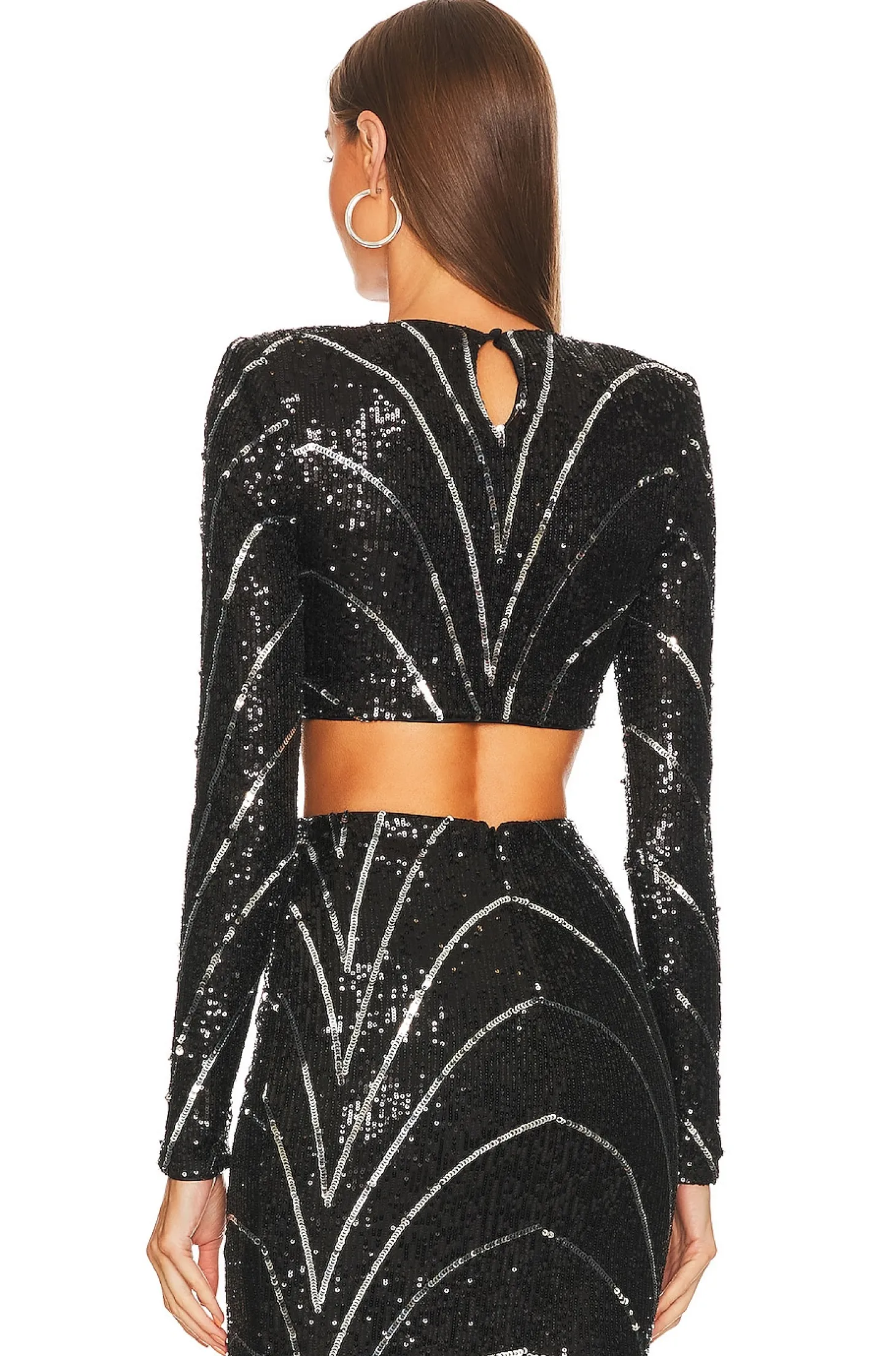 Self: 96% polyester 4% spandex Lining: 82% nylon 18% spandex.Made in China.Hand wash.Loop button closure at back.Padded shoulders.Sequin embellished mesh.Item not sold as a set