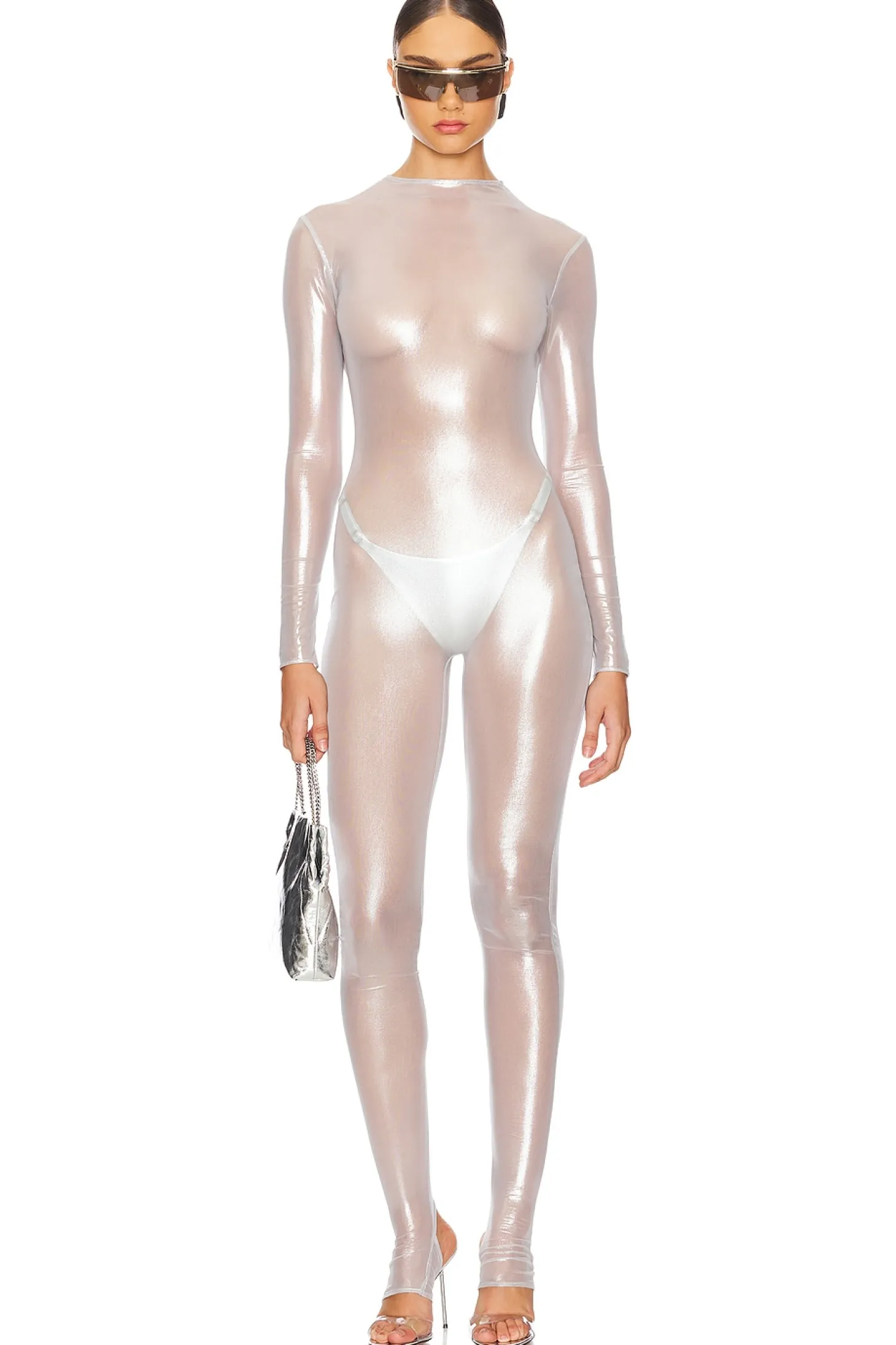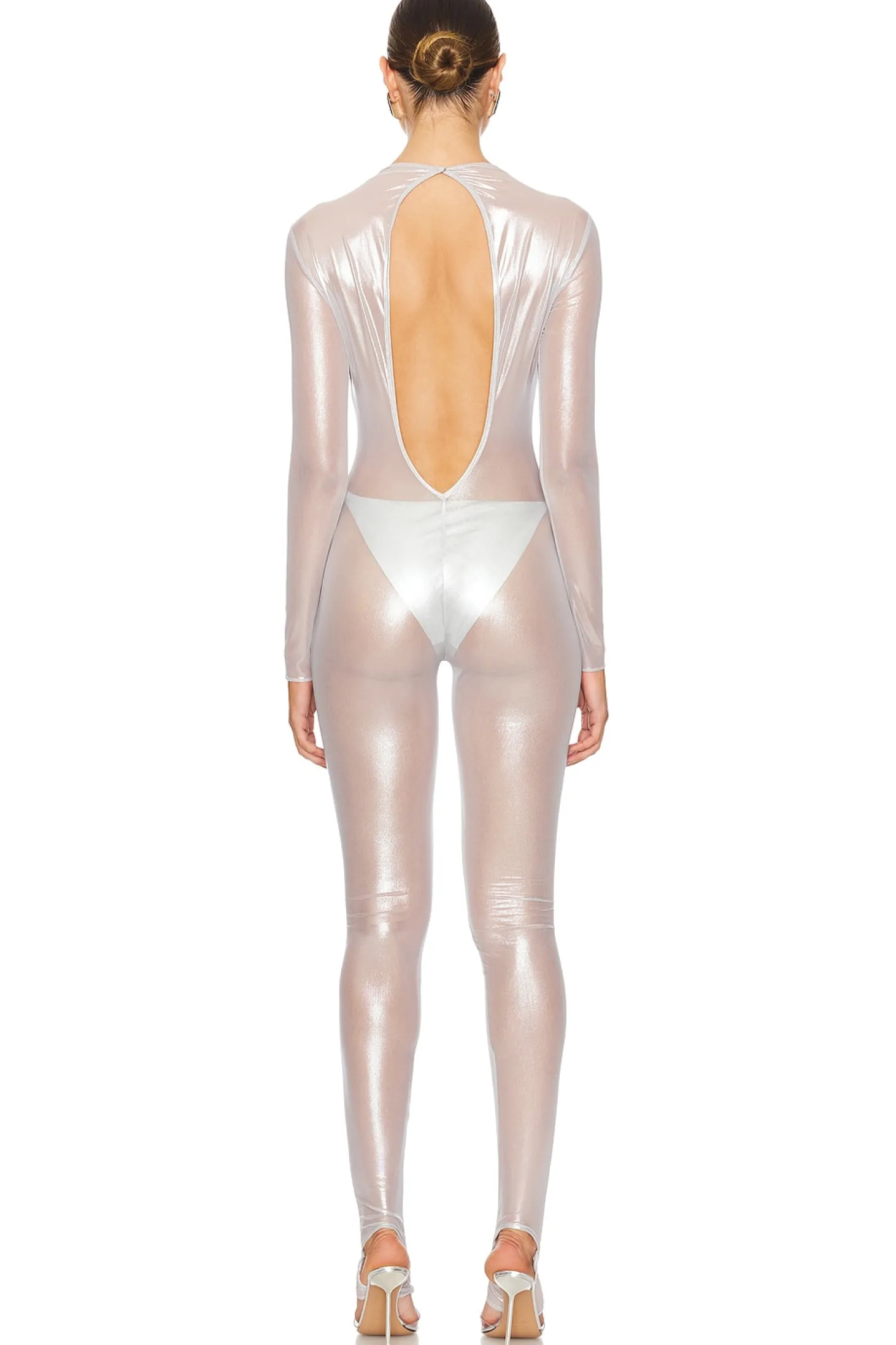 80% polyester 20% elastane.Made in USA.Hand wash.Back snap closure at neck with open back.Stirrup hem.Garment is intentionally sheer, undergarments will show through. Please note undergarment not included