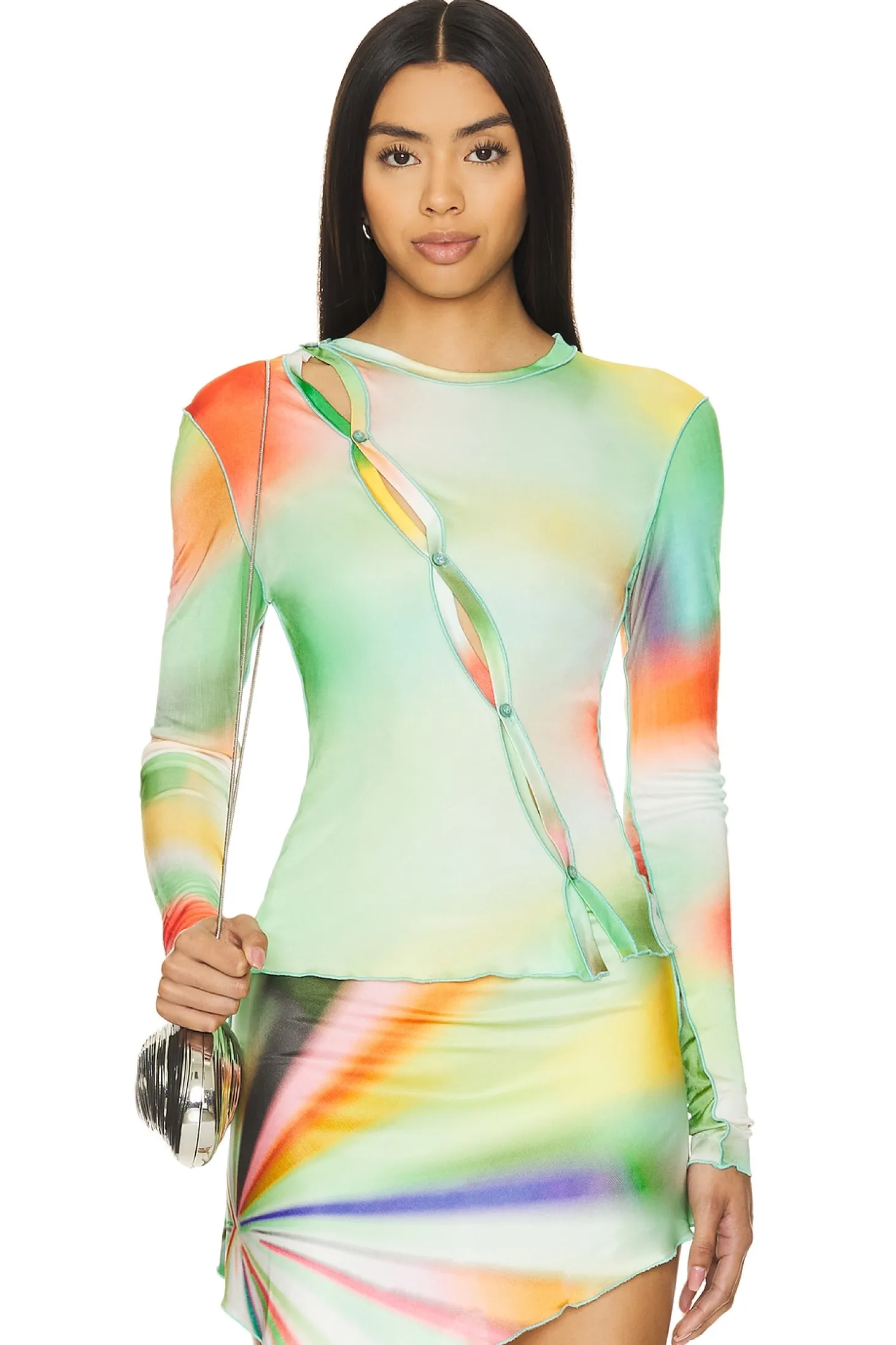 100% rayon.Made in Turkey.Machine wash.Garment is made with a semi-sheer fabric, undergarments can show through.Front button closure