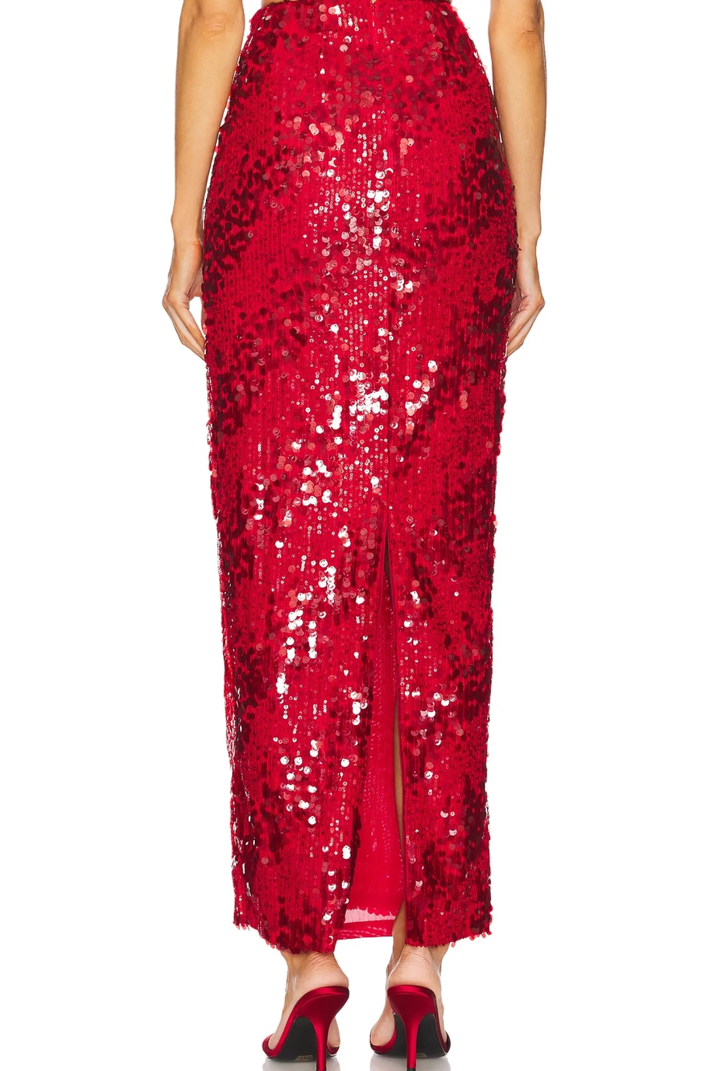 Self: 100% polyester Lining: 95% nylon 5% elastane.Made in China.Dry clean only.Fully lined.Hidden back zipper closure.Sequin embellished fabric with back vent.Item not sold as set.Skirt measures approx 42" in length