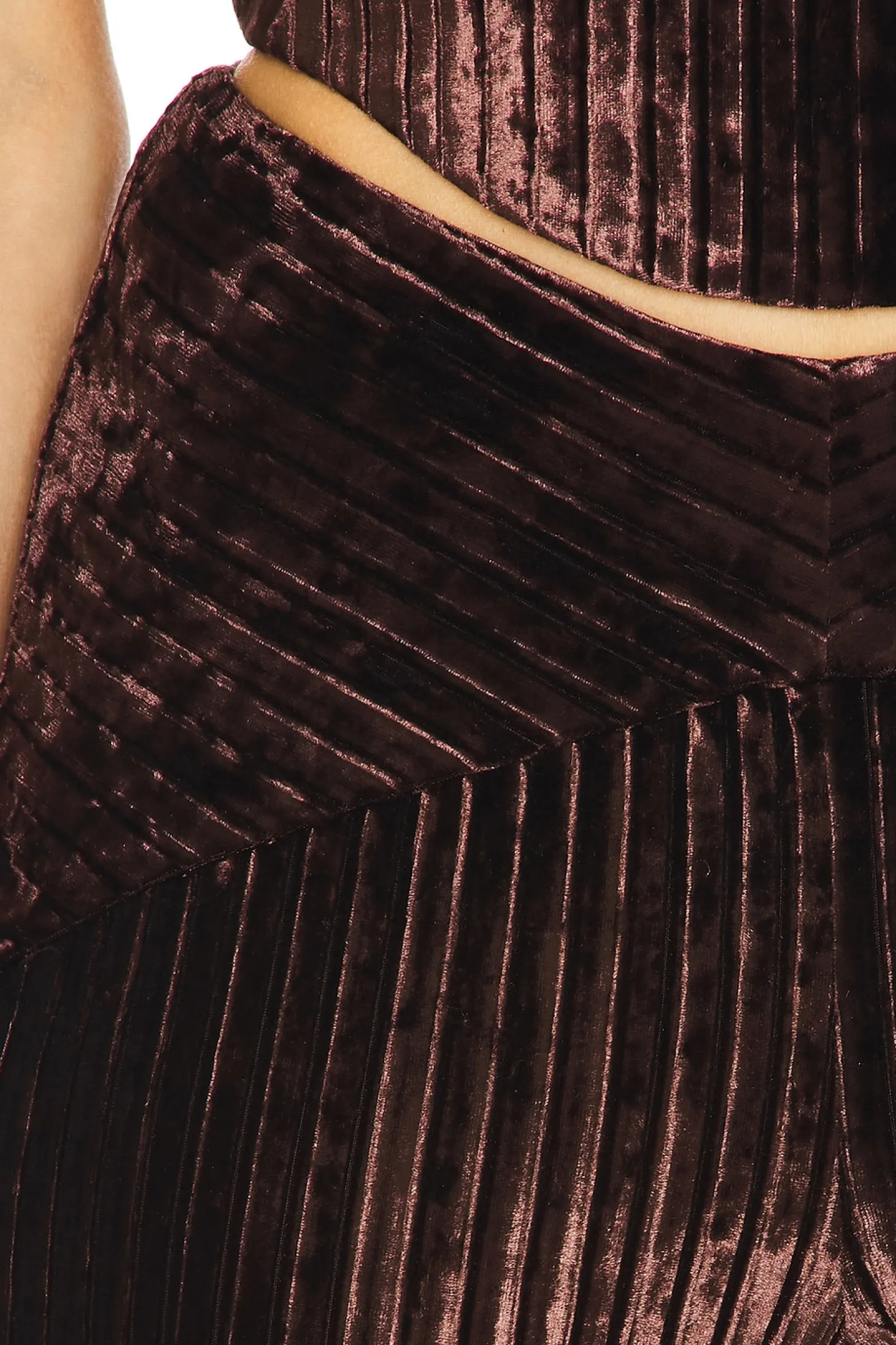 95% polyester 5% elastane.Made in China.Dry clean only.Hidden back zipper closure.Textured velvet fabric.Item not sold as set.15" at the knee breaks to 19" at the leg opening
