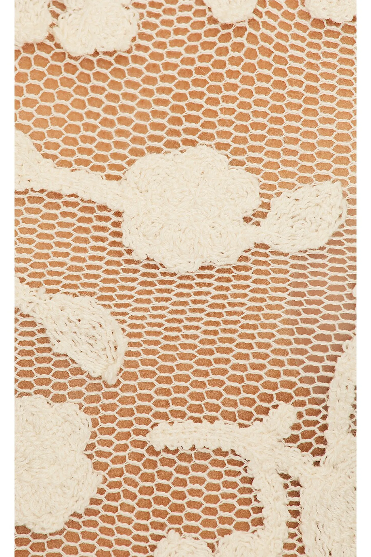 Acrylic blend.Imported.Hand wash recommended.Halterneck and back tie closure.Lightweight crochet knit fabric with crocheted floral design throughout.Item not sold as a set.Garment is intentionally sheer, undergarments will show through. Please note undergarment not included