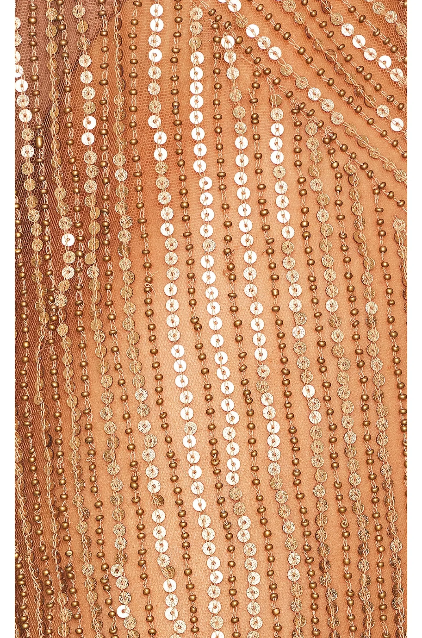 Self: 100% nylon Lining: 82% nylon 18% spandex.Made in India.Dry clean only.Hidden back zipper closure.Halterneck styling with hook and eye closure.Front cut-out detail.Mesh fabric with sequined and beaded embellishments throughout