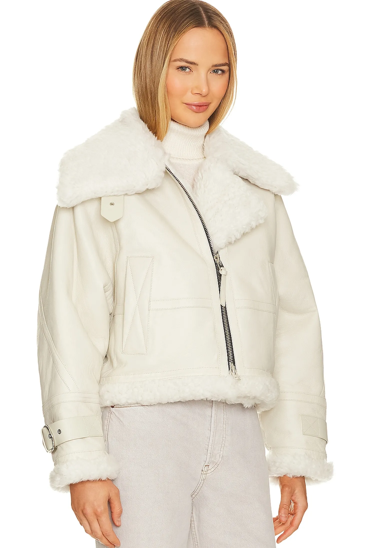 Self: 100% dyed sheepskin Trim: 100% cow leather.Fur Origin: Iceland.Made in Turkey.Professional leather clean only.Front zipper closure.Side seam pockets.Buckle detail at cuffs.Midweight leather fabric with dyed fur lining