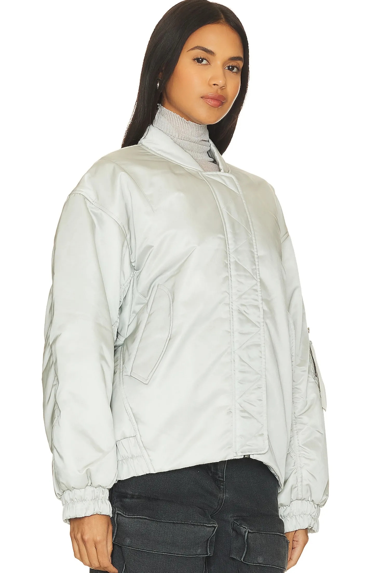 Self: 100% recycled polyamide Lining: 100% recycled polyester Filling: 70% recycled polyester 30% polyester.Made in Vietnam.Dry clean only.Exposed front zipper and snap button closures.Front flap pockets with button closures.Utility sleeve pocket.Ruched elastic cuffs and hem.Puff jacket with ripstop fabric