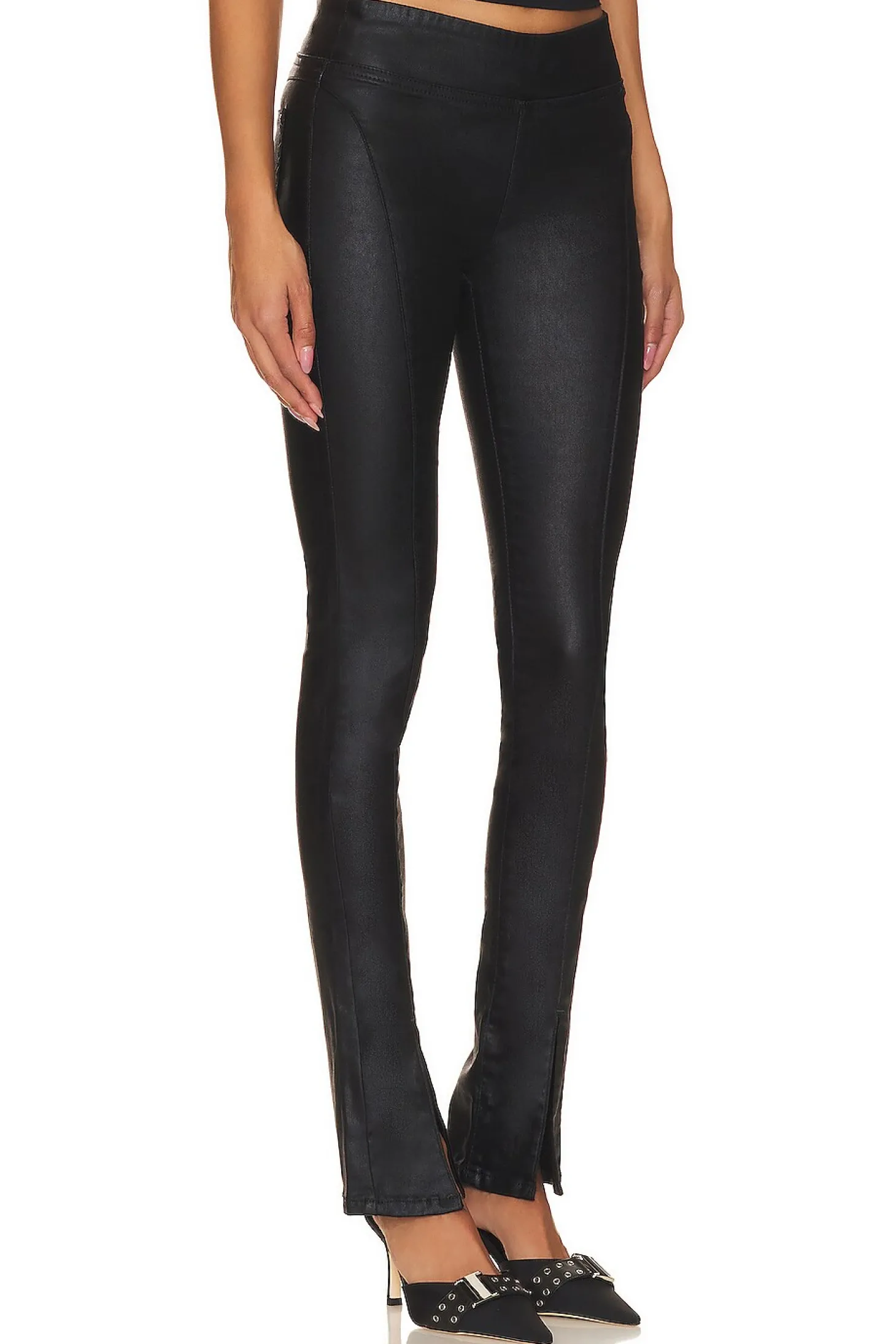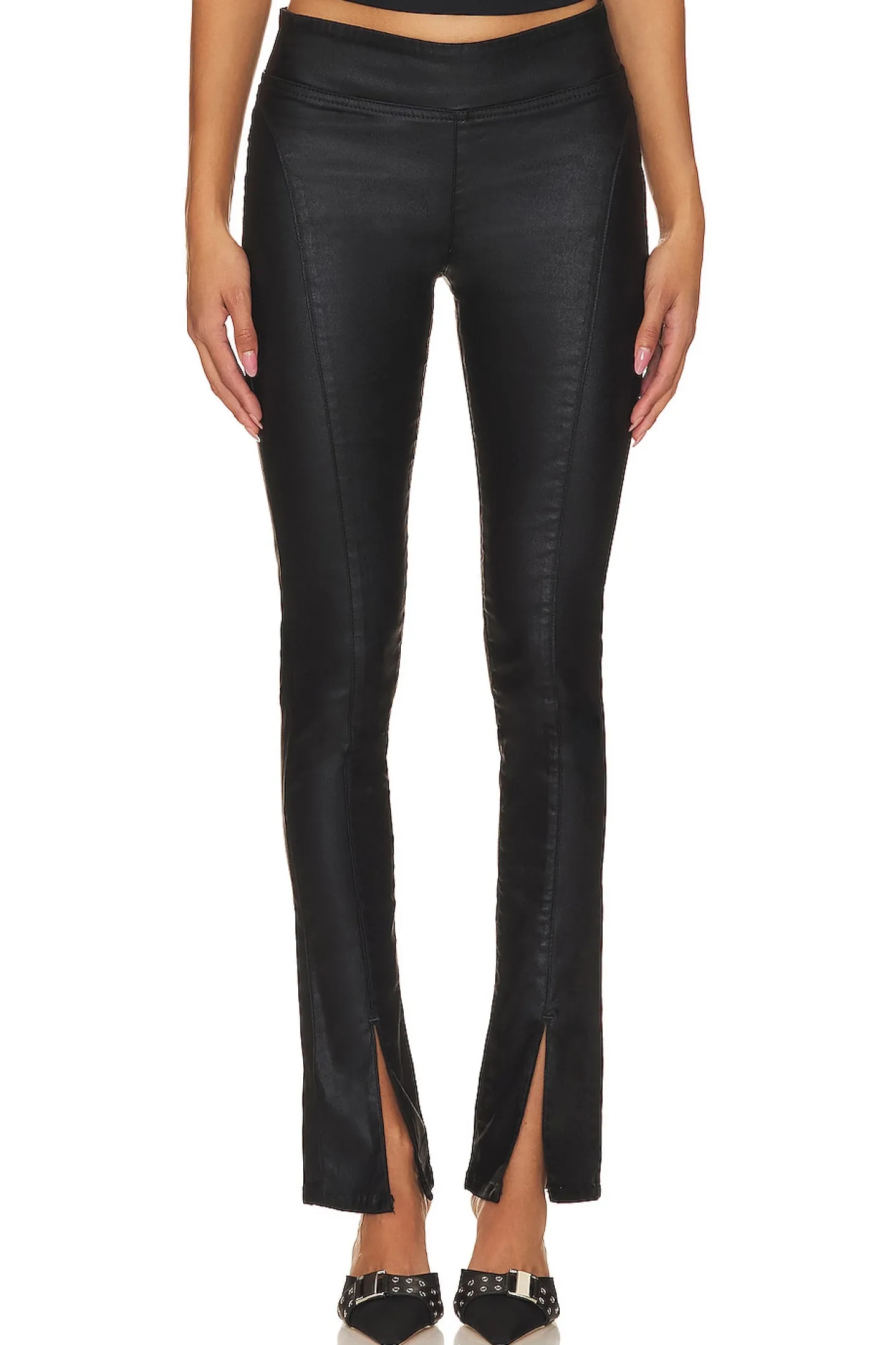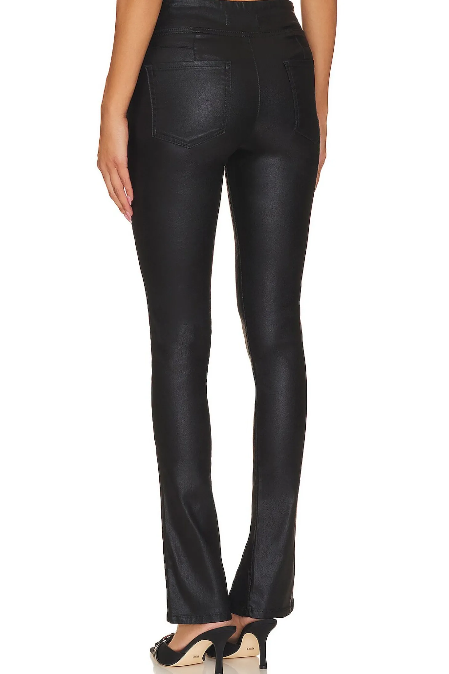 The Double Dutch Coated Pull On by Free People is a bold fashion statement. With a high-rise, slim flare silhouette and buttery faux leather fabric, these pants demand attention. Whether you pair them with a chic going-out top or a casual tee, they're new your go-to choice year round..71% cotton 26% polyester 3% elastane.Made in Turkey.Machine wash.Elastic waistband.Back slip pockets.Split hem Stretch fit faux leather fabric.14" at the knee narrows to 12" at the leg opening