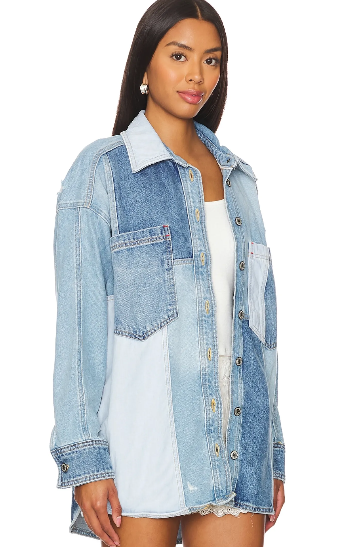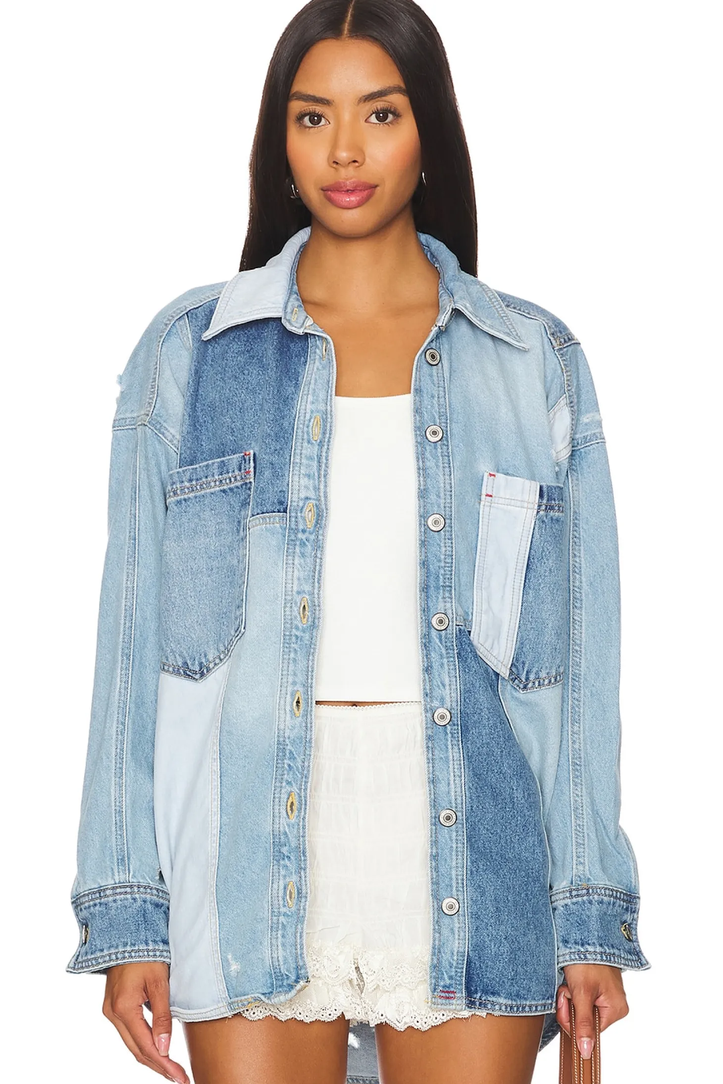 100% cotton.Made in Turkey.Machine wash.Front button closure.Breast pockets.Buttoned cuffs.Patchwork denim design