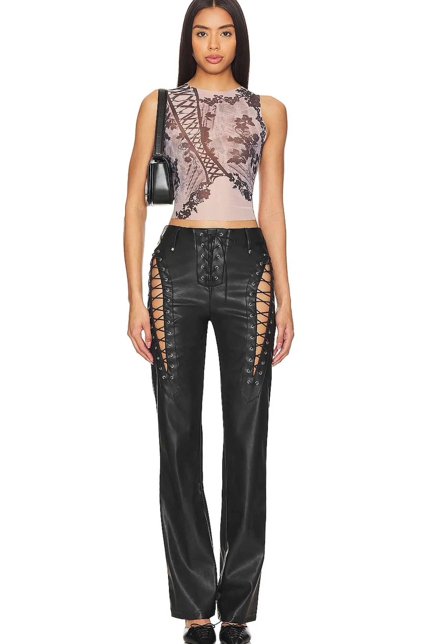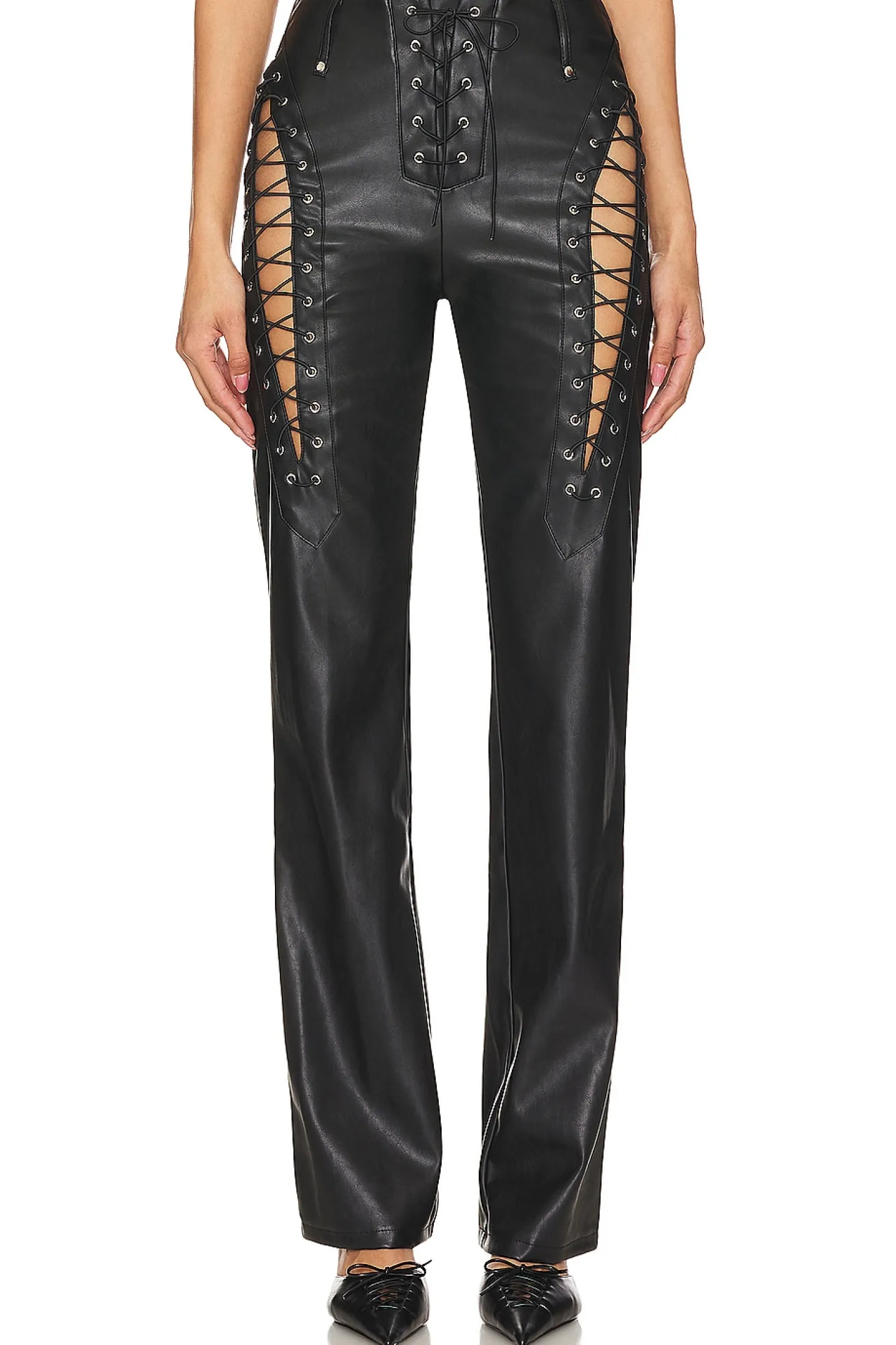 Self: 100% polyurethane Lining: 100% polyester.Made in China.Spot clean only.Front lace-up closure.Side cut-outs with lace detail.Faux leather fabric.15" at the knee breaks to 21" at the leg opening