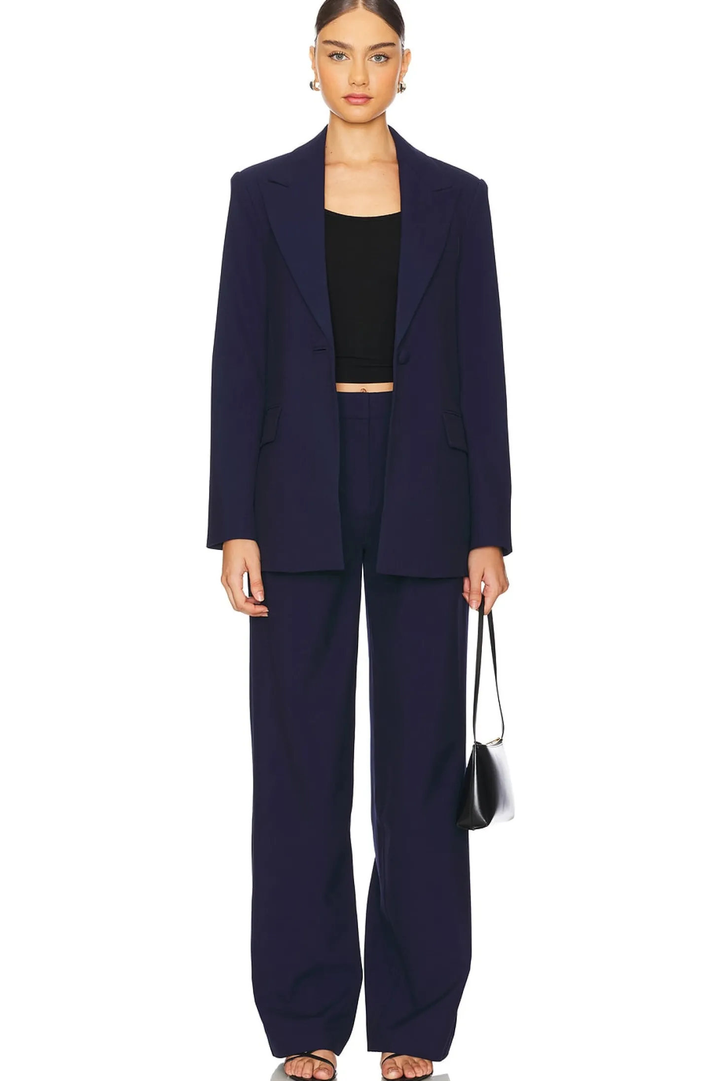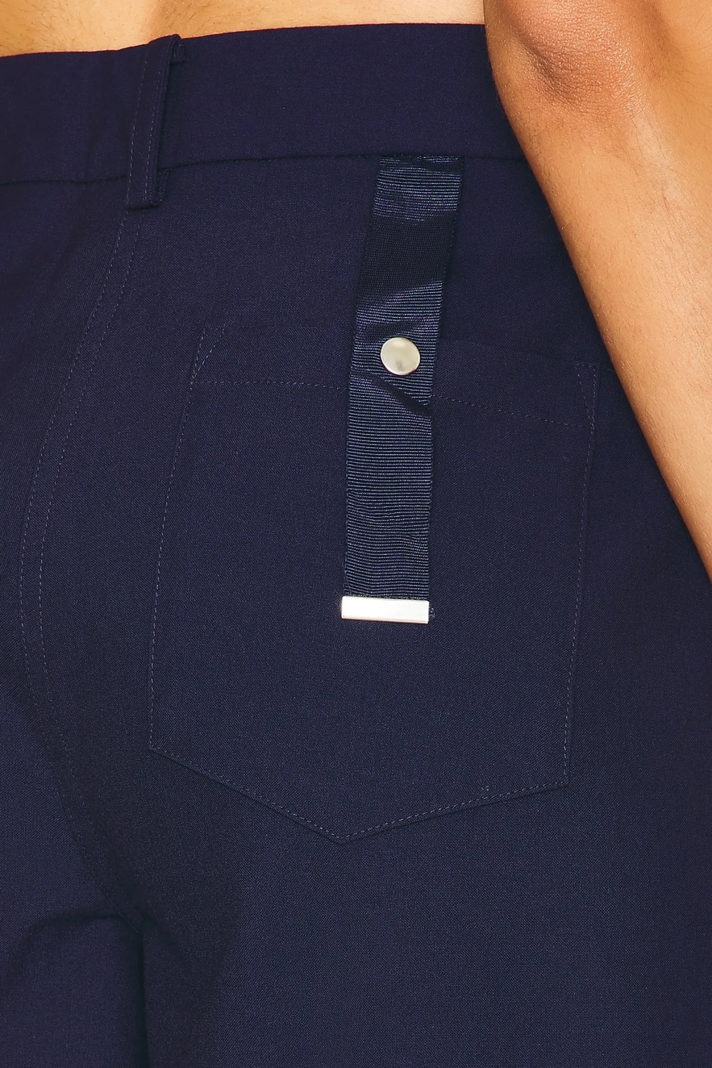 66% polyester 30% viscose 4% elastane.Made in China.Dry clean only.Zip fly with hook and bar closure.4-pocket design.Front pintuck detail.Lightweight suiting fabric Item not sold as a set.22" at the knee narrows to 20" at the leg opening